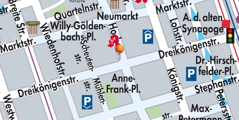 Das tolle Eckladenlokal befindet sich in der Krefelder-Fußgängerzone (Hochstraße) in der Nähe des Neumarktes. In der Nachbarschaft ist eine Vielfalt von Geschäften vertreten. Innerhalb weniger Gehminuten befinden sich die Haltestellen der öffentlichen Verkehrsmittel auf Ost- und Südwall, wo alle Krefelder Straßenbahnlinien und eine große Anzahl von Buslinien genutzt werden können. Auch der Hauptbahnhof ist nur wenige Gehminuten entfernt. Öffentliche Parkplätze für Ihre Kunden befinden sich in direkter Umgebung.