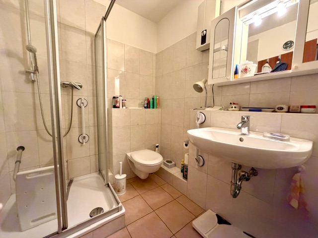 Die Wohnung verfügt über ein helles Wohnzimmer mit Zugang zum Balkon, ein gut geschnittenes Schlafzimmer, eine funktionale Einbauküche mit Essecke sowie ein Bad mit Dusche und Platz für Waschmaschine und Trockner.