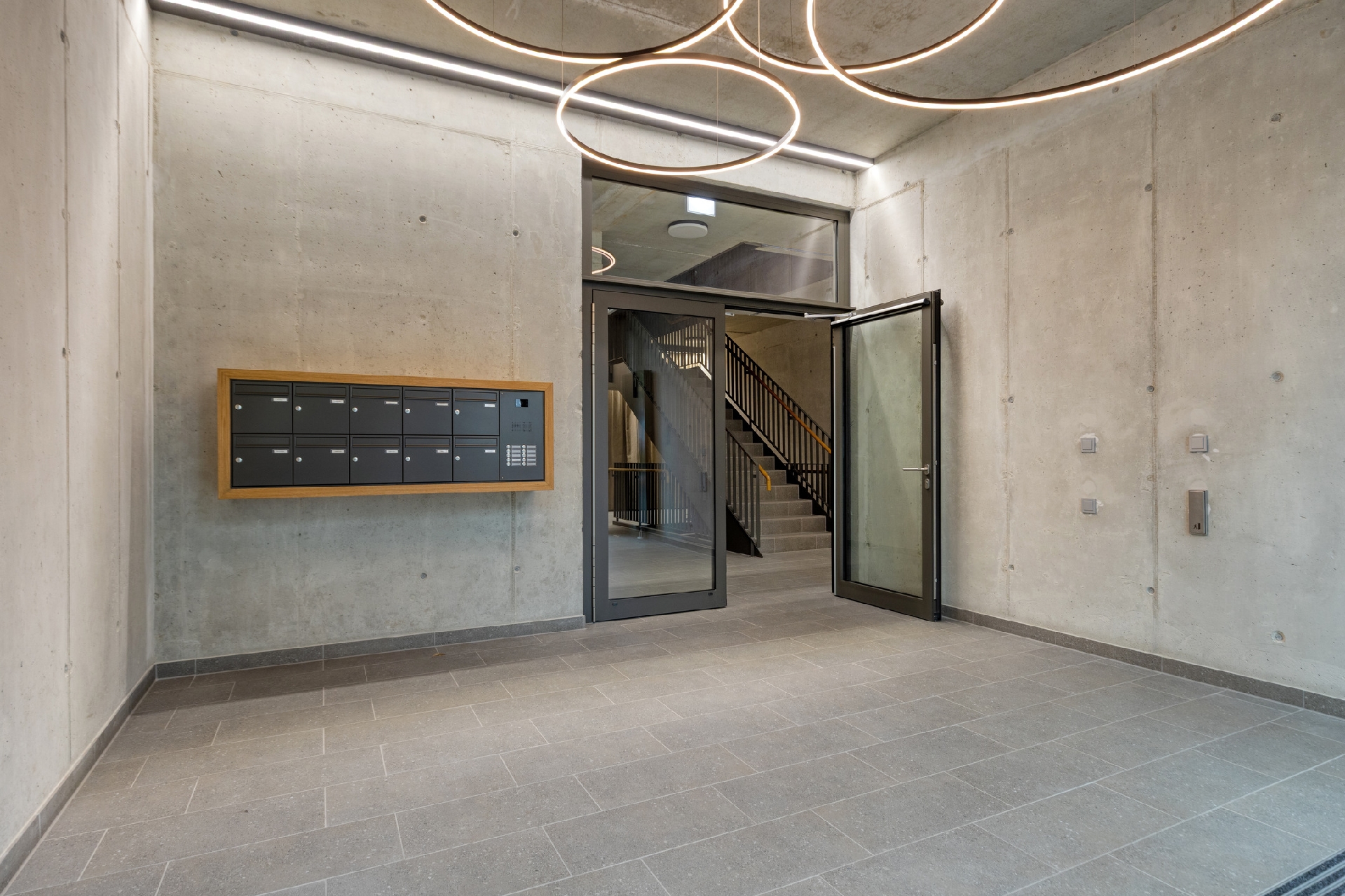 – Wände in moderner Sichtbeton-Optik für zeitgemäßes, industrielles Ambiente
