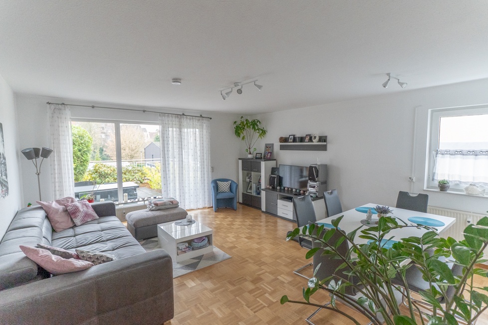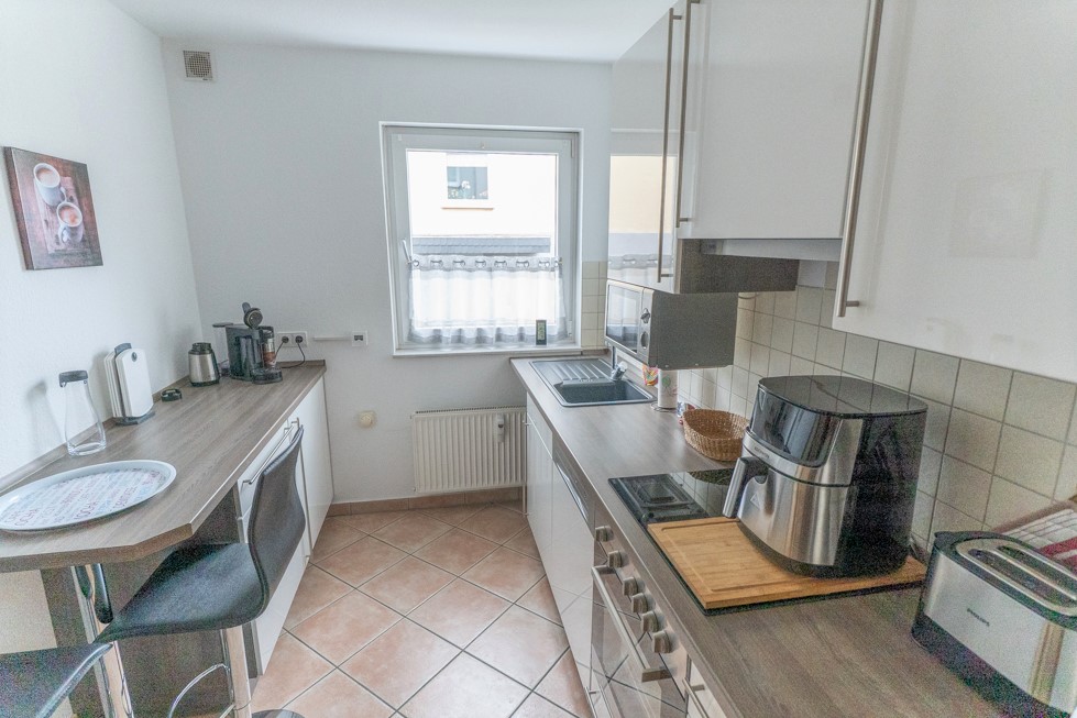 Direkt neben dem Wohn-/ Esszimmer liegt die Küche. Zudem stehen zwei gut geschnittene Schlafzimmer, ein modern gefliestes Tageslichtbad mit Badewanne und Dusche sowie ein innenliegendes Gäste-WC zur Verfügung.