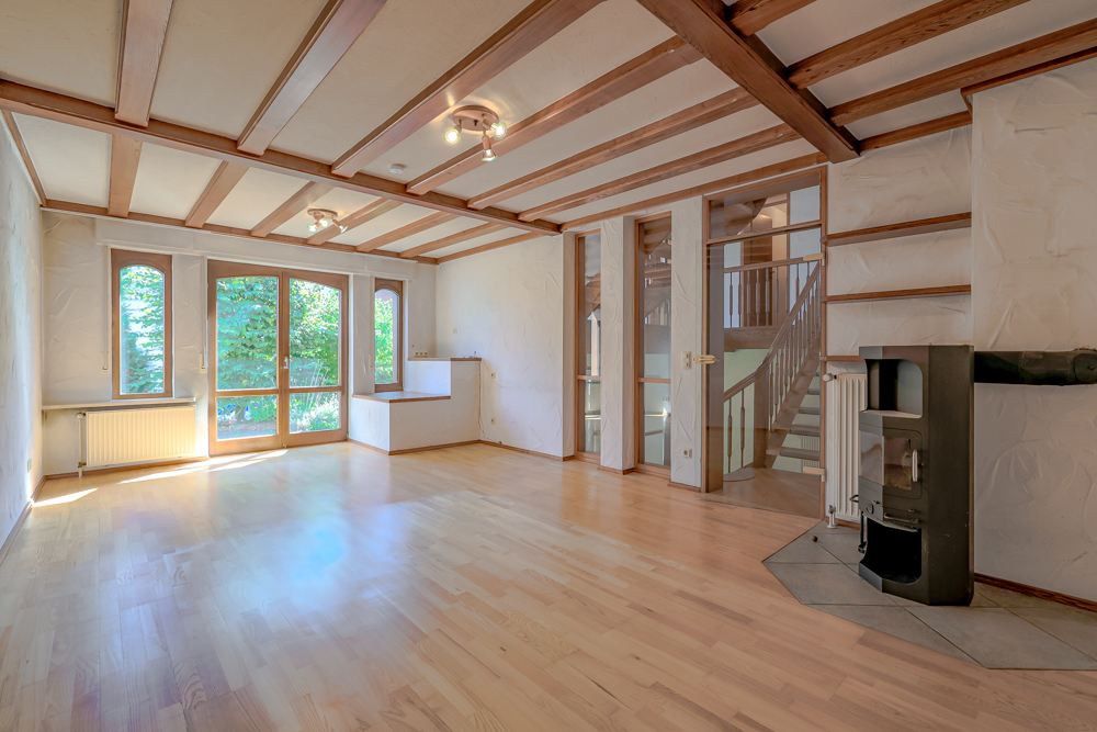 • Wohnbereich: Auf halber Treppe vom Erd- zum Obergeschoss erreichen Sie das gemütliche Wohnzimmer mit Parkettboden, Kaminofen und direktem Zugang zur Terrasse.