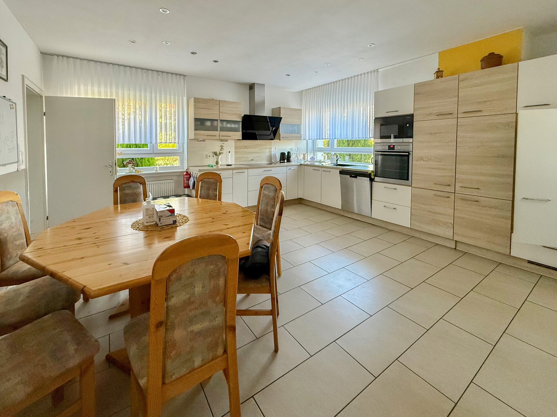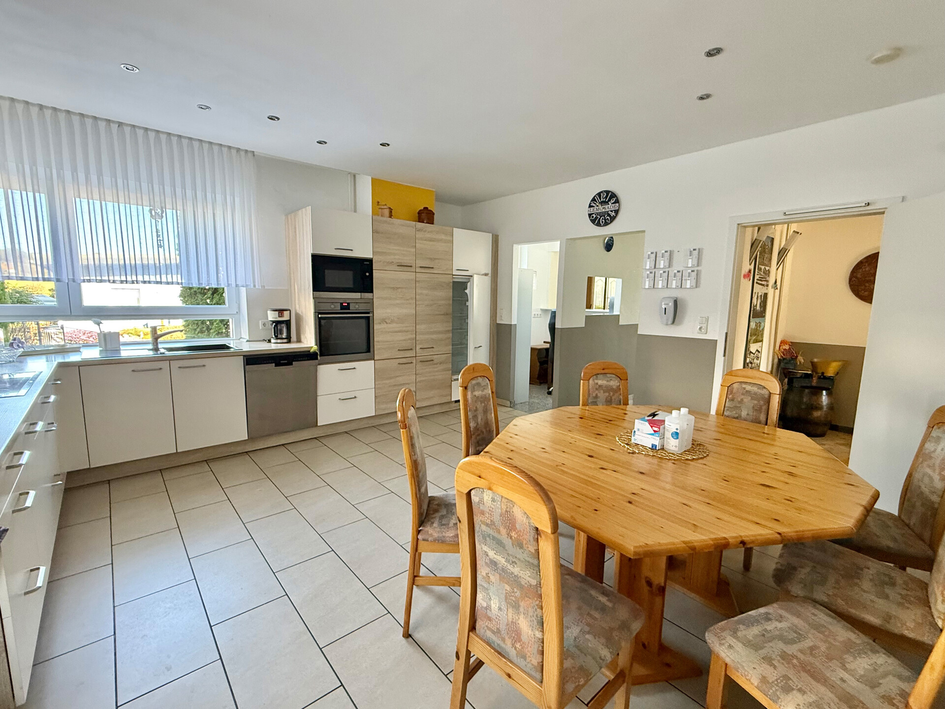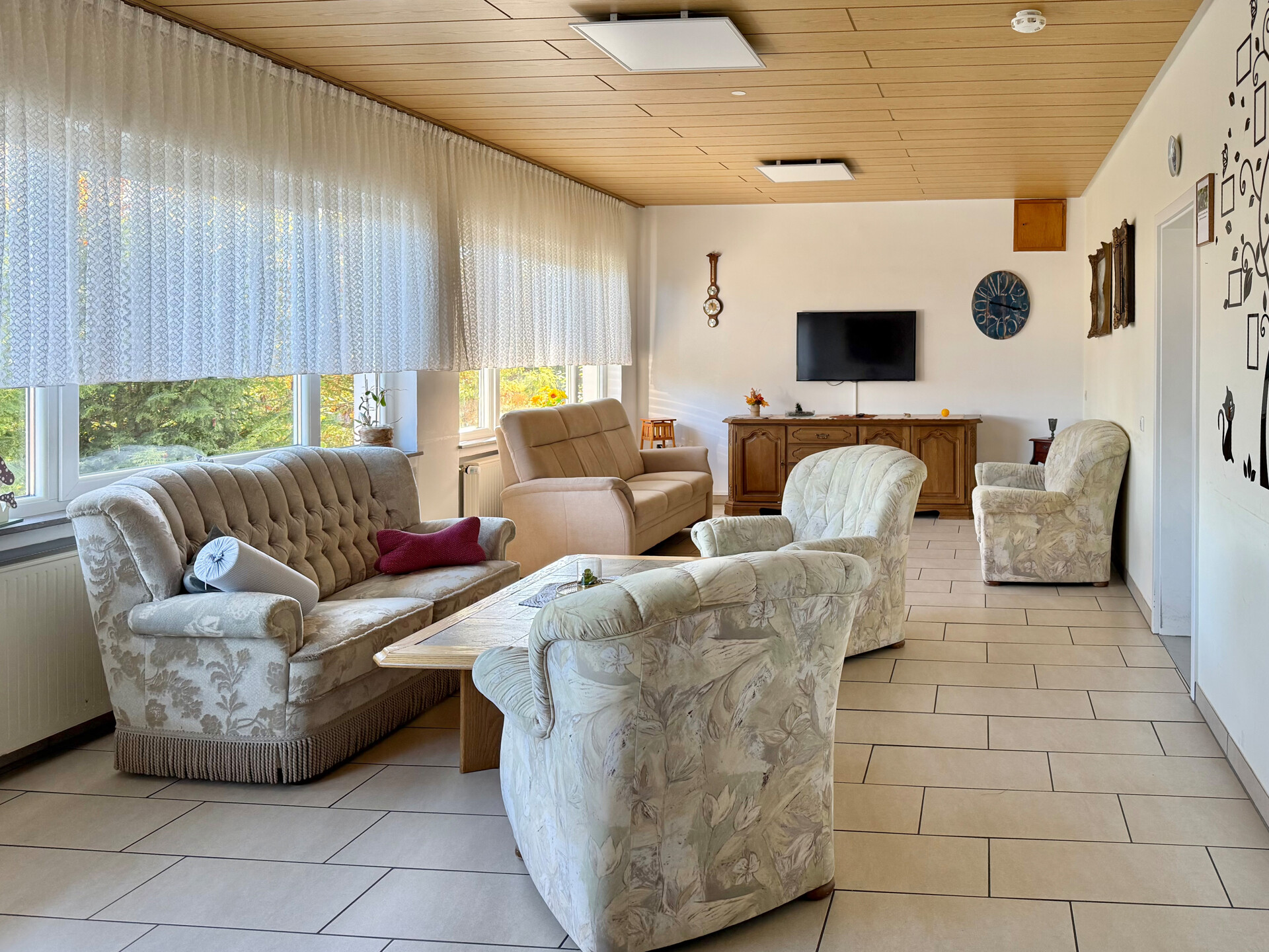 Die Wohnfläche beträgt ca. 285 m², ergänzt durch 142 m² Nutzfläche. Helle, freundliche Zimmer, ein großer Aufenthaltsraum mit Wohnküche sowie ein Balkon mit Fernblick sorgen für ein wohnliches Umfeld. Das parkähnliche Grundstück umfasst ca. 3.459 m² mit Terrasse, Garten, 1.552 m² Waldfläche und zahlreichen befestigten Stellplätzen. Das Inventar kann bei Bedarf übernommen werden.