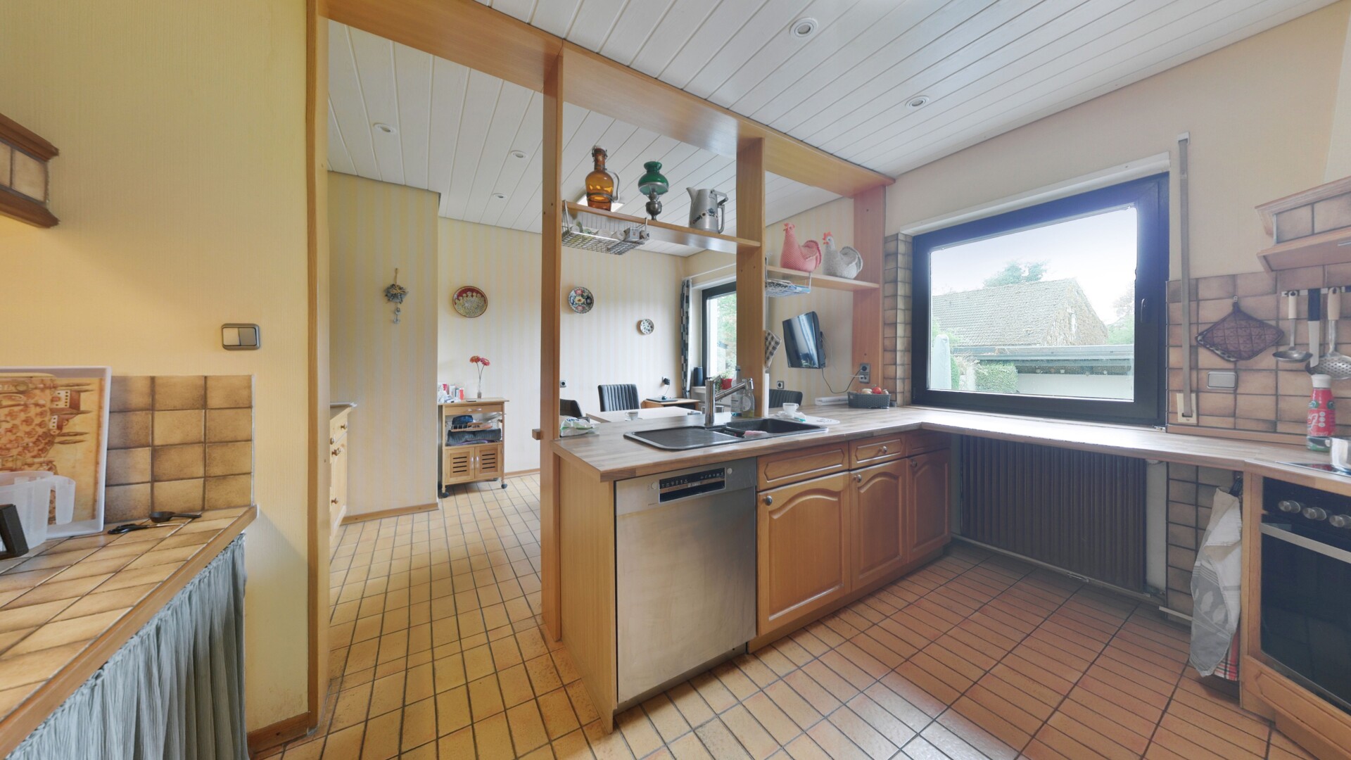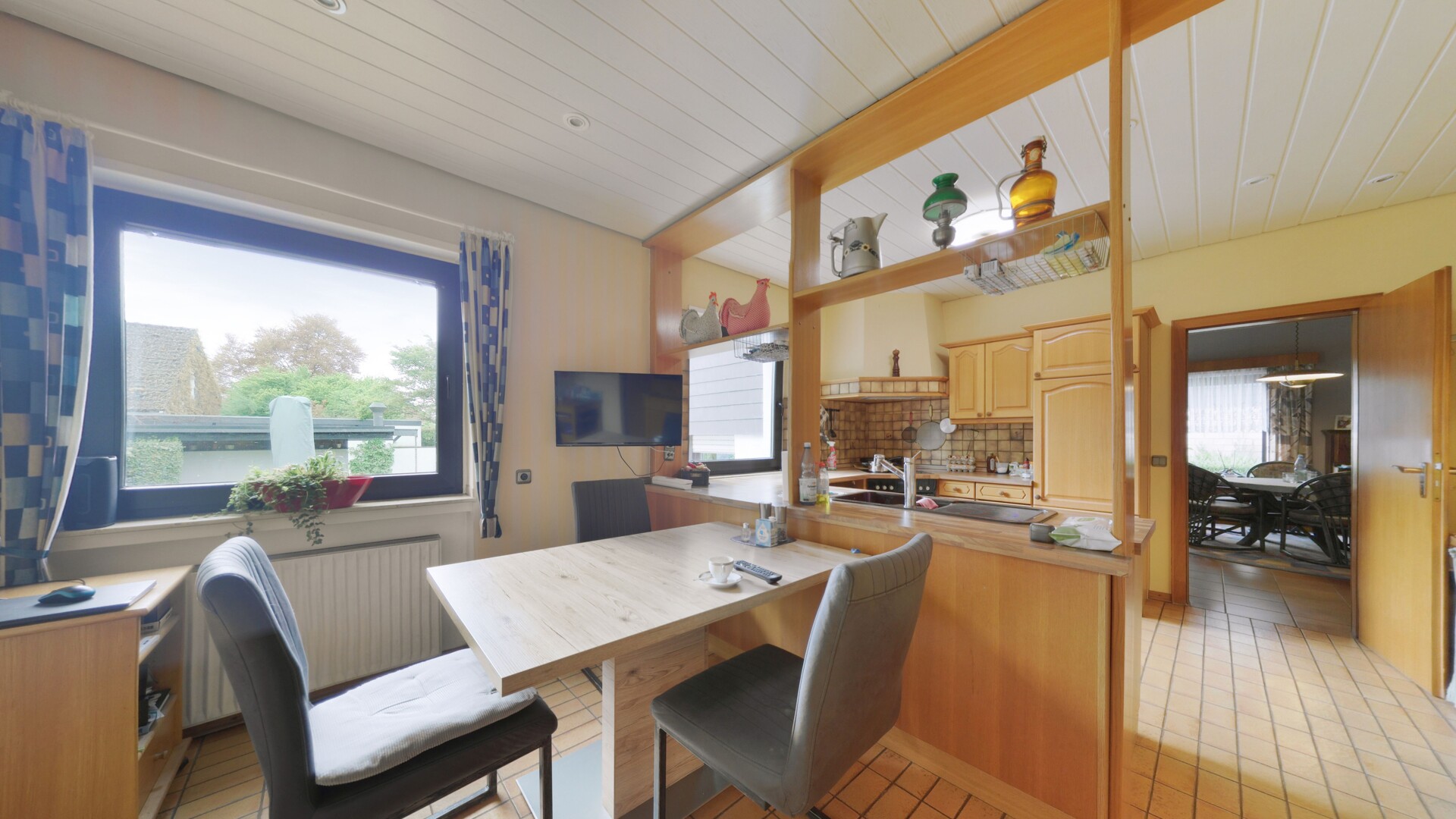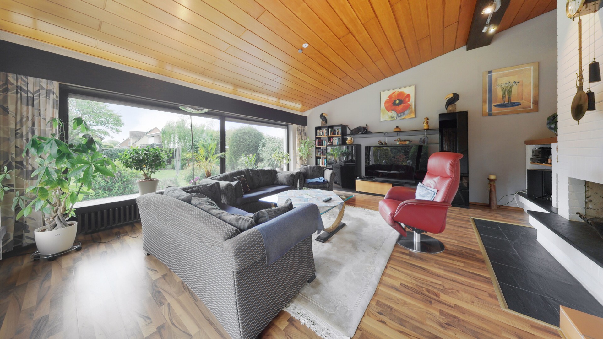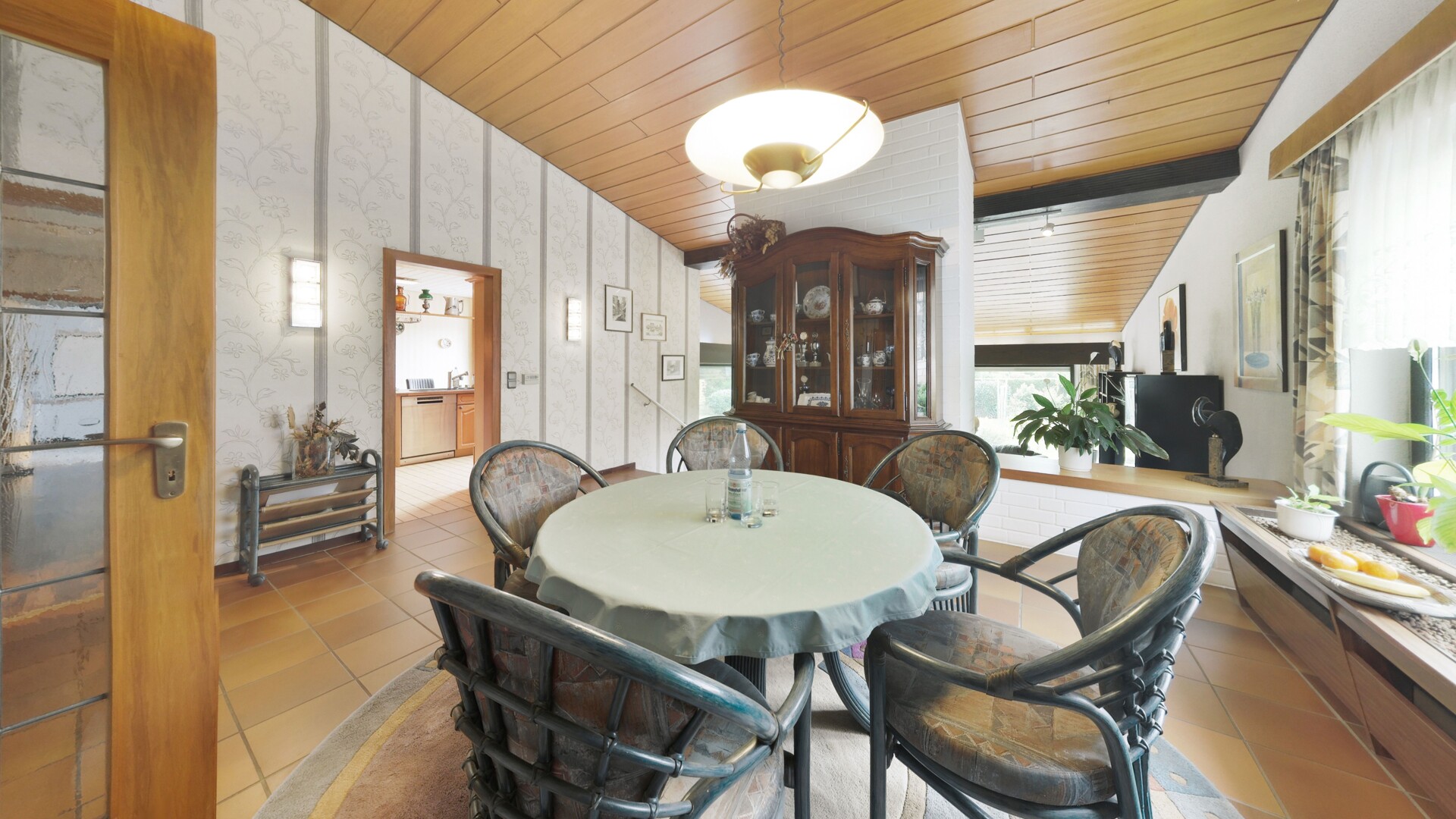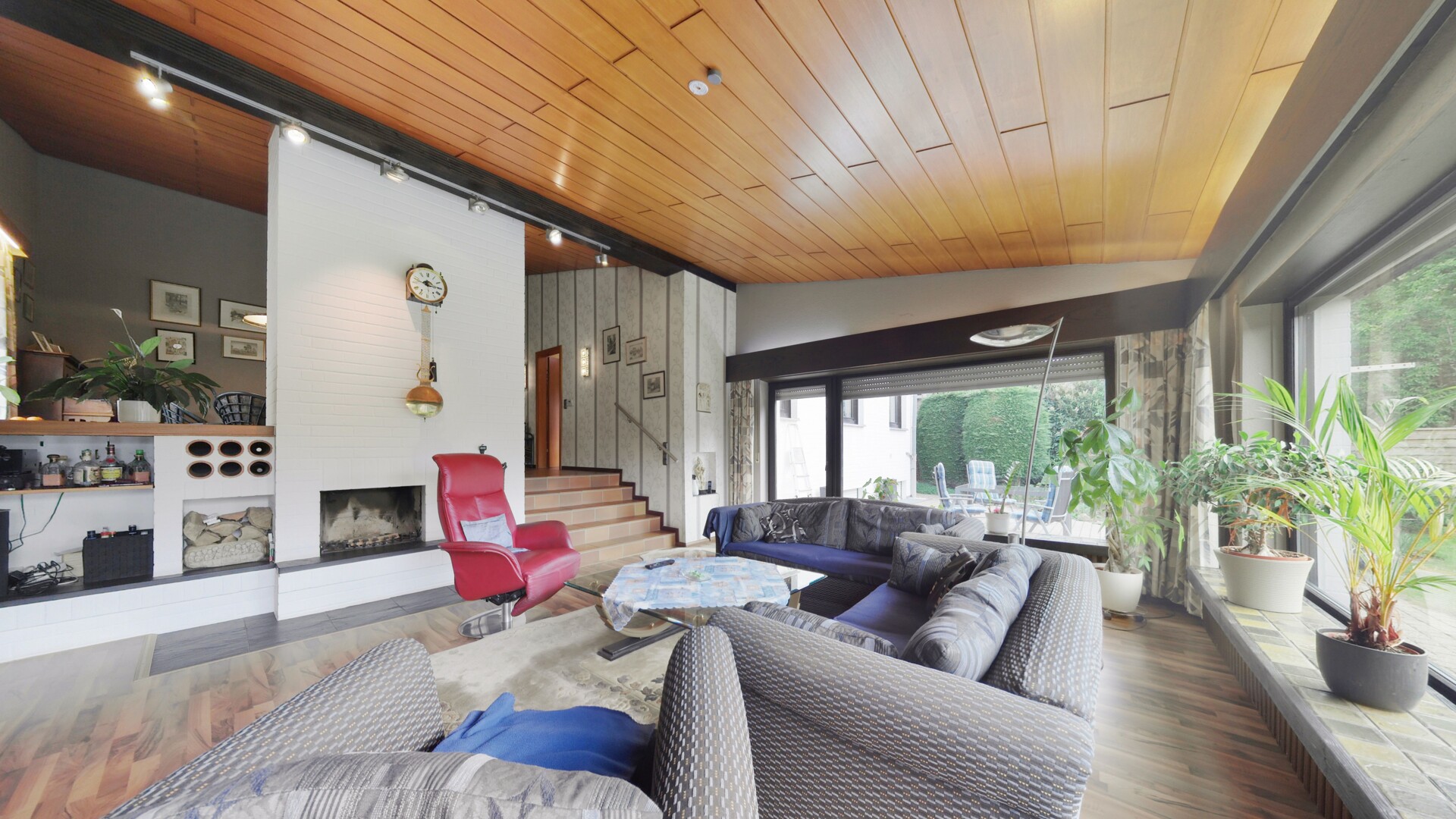 Das Herzstück des Hauses ist das lichtdurchflutete Erdgeschoss, das durch seine offene Gestaltung eine einladende Großzügigkeit ausstrahlt. Der helle Wohnbereich mit seinen großen Fensterfronten gibt den Blick frei in den weitläufigen, liebevoll angelegten Garten und schafft so eine harmonische Verbindung zwischen Innen und Außen. Ein Kamin bildet hier den optischen Ankerpunkt und verspricht behagliche Abende in privater Atmosphäre. Direkt an den Wohnbereich schließt sich der zentral angeordnete Essbereich an, der fließend in die funktional gestaltete Küche übergeht und somit den idealen Rahmen für das tägliche Familienleben oder gesellige Abende mit Gästen bietet. Der Eingangsbereich wirkt einladend und vermittelt bereits beim Betreten das solide Raumgefühl dieser besonderen Immobilie.