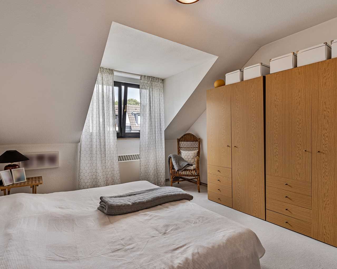 Das Schlafzimmer ist ruhig gelegen und bietet ausreichend Platz für ein Doppelbett und Kleiderschränke. Das Wannenbad mit Platz für die Waschmaschine, sowie die kleine Abstellkammer im Flur runden das Raumangebot ab.