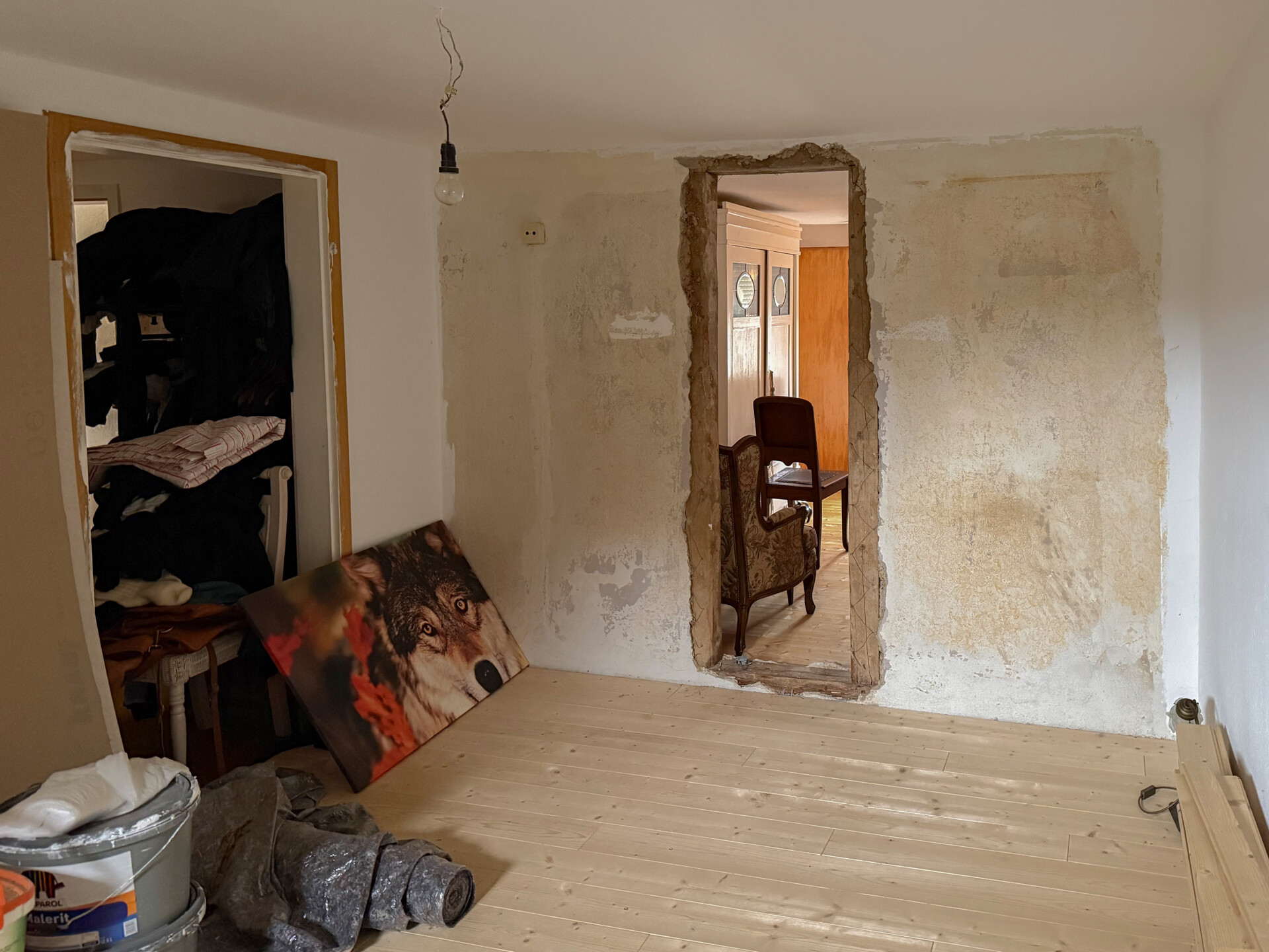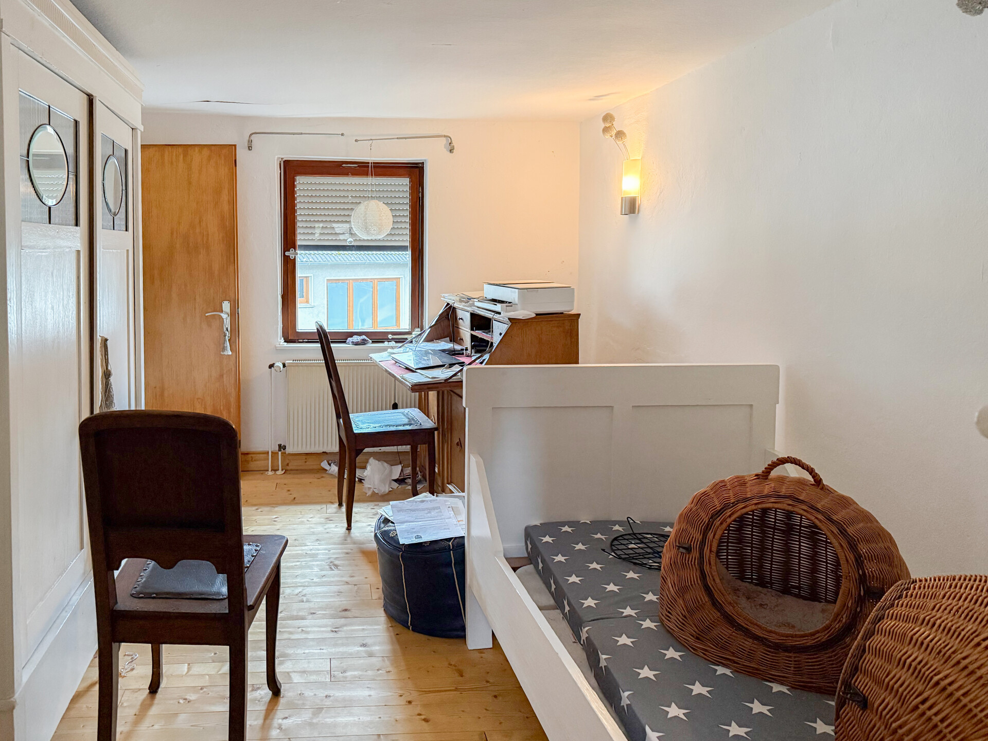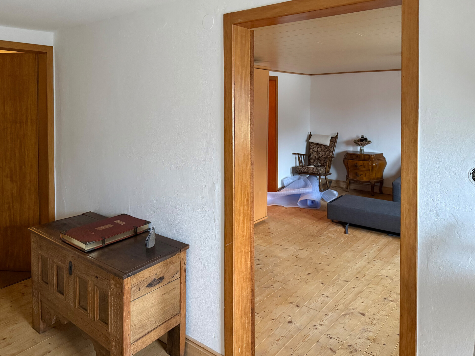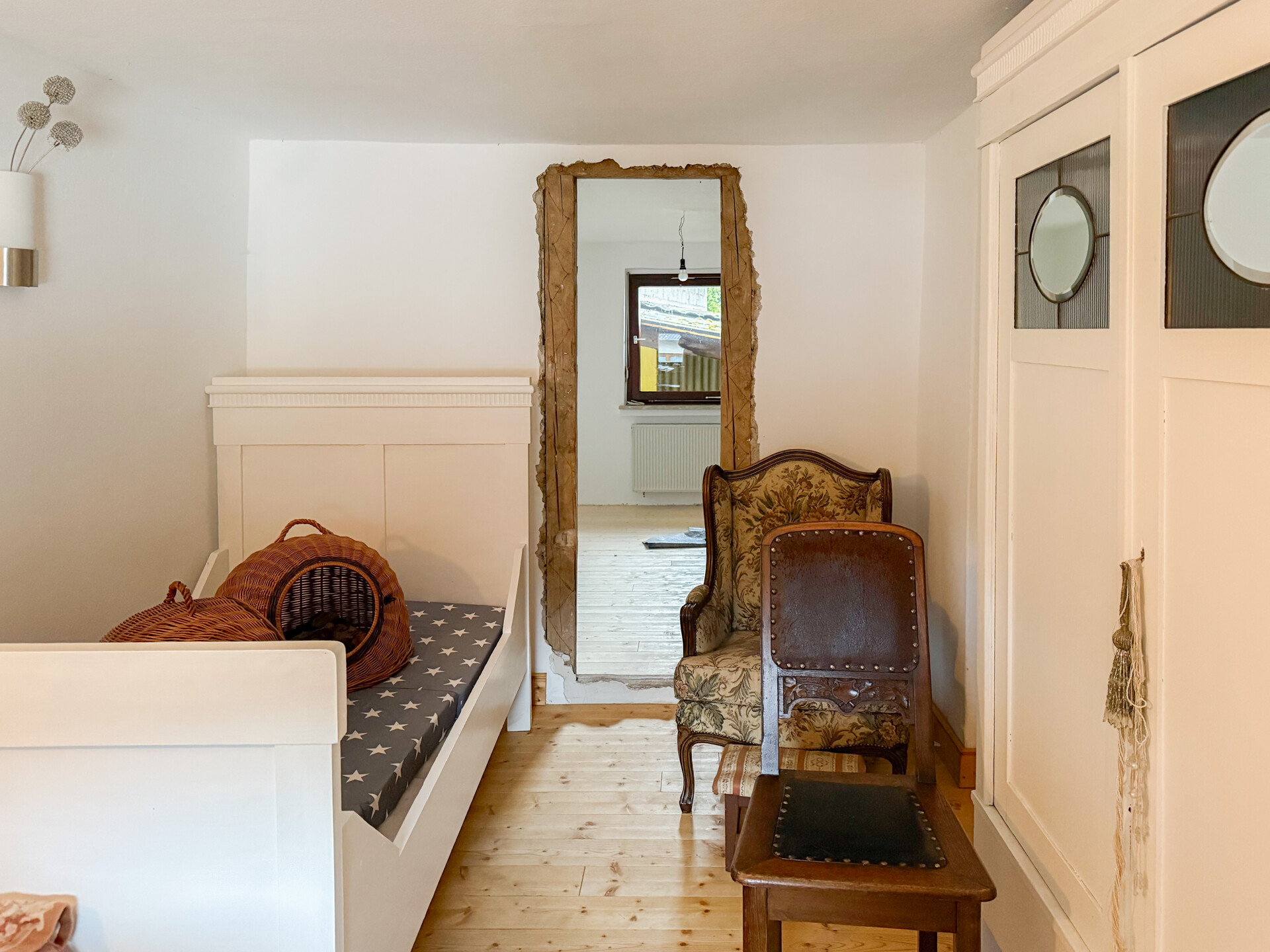 Der Wohnbereich erstreckt sich über 2 Etagen. Im Erdgeschoss befinden sich die Küche sowie ein geräumiger Wohn-/Essbereich, die zurzeit vom Eigentümer neu gestaltet werden. Ergänzt wird diese Etage durch einen Vorratsraum, ein großes Bad sowie ein Zimmer, welches sich ideal als Büro eignet. Das Obergeschoss wurde bereits umfangreich renoviert. So wurden z.B. ein neuer Dielenboden verlegt und die Wände mit einem Kalkputz versehen. Im Obergeschoss befinden sich insgesamt 5 Zimmer und ein Balkon mit Südausrichtung. Der Dachboden ist über eine Treppe erreichbar und noch ausbaufähig.