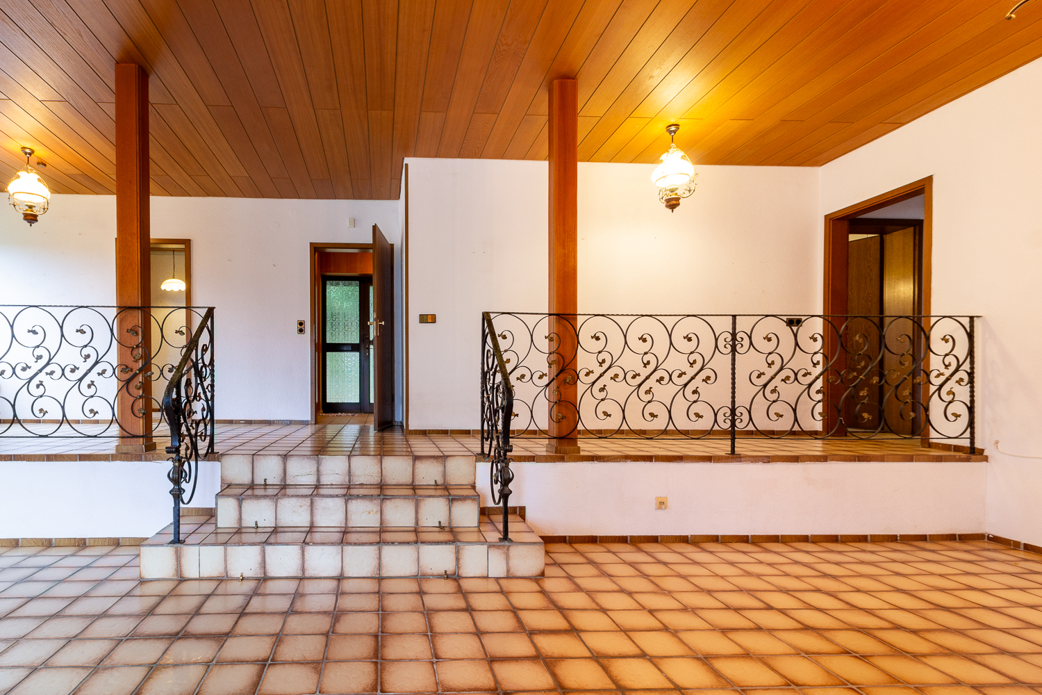 Von der Diele aus eröffnet sich das Herzstück des Hauses, das großzügige Wohn-/Esszimmer, welches sich über zwei Etagen erstreckt. Dank der großen Fensterfront kommt viel Licht herein und ebenso eröffnet sich der Blick ins Grüne. Über den Essbereich gelangen Sie in Ihre Küche, von ihr geht eine kleine, separate Terrasse ab, die sich perfekt für den morgendlichen Kaffee oder eine ruhige Pause zwischendurch anbietet. Durch die vorhandene Raumaufteilung bietet sich die Umgestaltung der Küche zu einer offenen Wohnküche an, sodass Kochen, Essen und Wohnen künftig nahtlos ineinander übergehen können und ein moderner Lebensmittelpunkt entsteht.