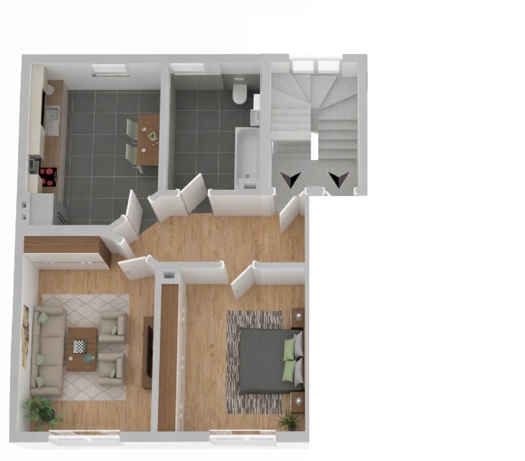 Beim Betreten der Wohnung gelangen Sie in die Diele, von der aus alle Räume zentral erreichbar sind. Links liegt das Schlafzimmer, das ausreichend Platz für ein Doppelbett und einen Kleiderschrank bietet. Daran anschließend befindet sich das Wohnzimmer.