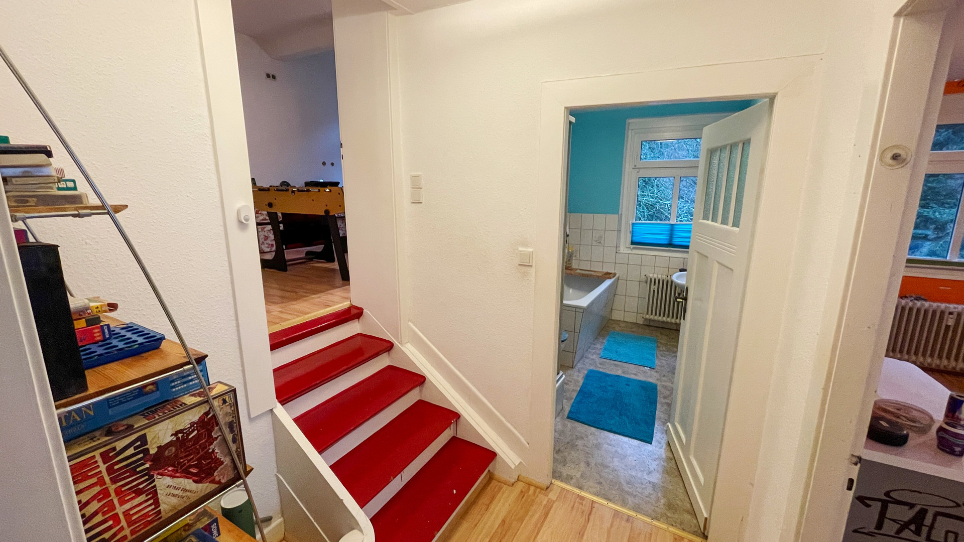 Dieses gepflegte Einfamilienhaus wurde in den 1920er-Jahren auf einem ca. 925 m² großen Grundstück errichtet und bietet direkten Zugang zur Agger. Die Wohnfläche von ca. 158 m² verteilt sich auf insgesamt sieben Zimmer und bietet vielfältige Nutzungsmöglichkeiten. Im Erdgeschoss erwartet Sie neben der einladenden Diele eine separate Küche sowie ein großzügiger Wohnbereich mit direktem Übergang zum offenen Esszimmer – ideal für gesellige Stunden mit Familie und Freunden. Im Obergeschoss befinden sich die Schlaf- und Kinderzimmer sowie zwei Badezimmer, die jeweils mit einer Badewanne ausgestattet sind. Ein zusätzliches Durchgangszimmer bietet sich optimal als Hobby- oder Arbeitsraum an. Der liebevoll angelegte Garten mit Blick auf die Agger bietet viel Potenzial für individuelle Gestaltungsideen. Weitere Stauflächen stehen Ihnen im Kellergeschoss zur Verfügung. Abgerundet wird das Angebot durch eine Garage sowie eine Gartenterrasse.