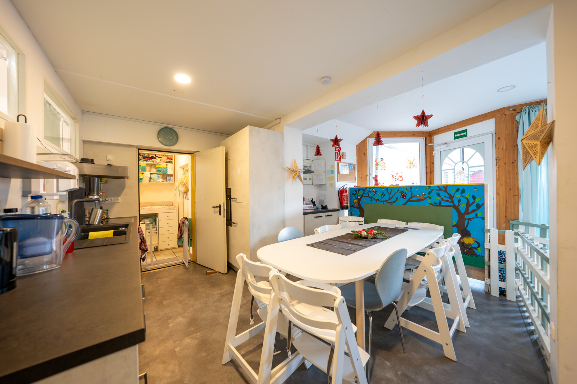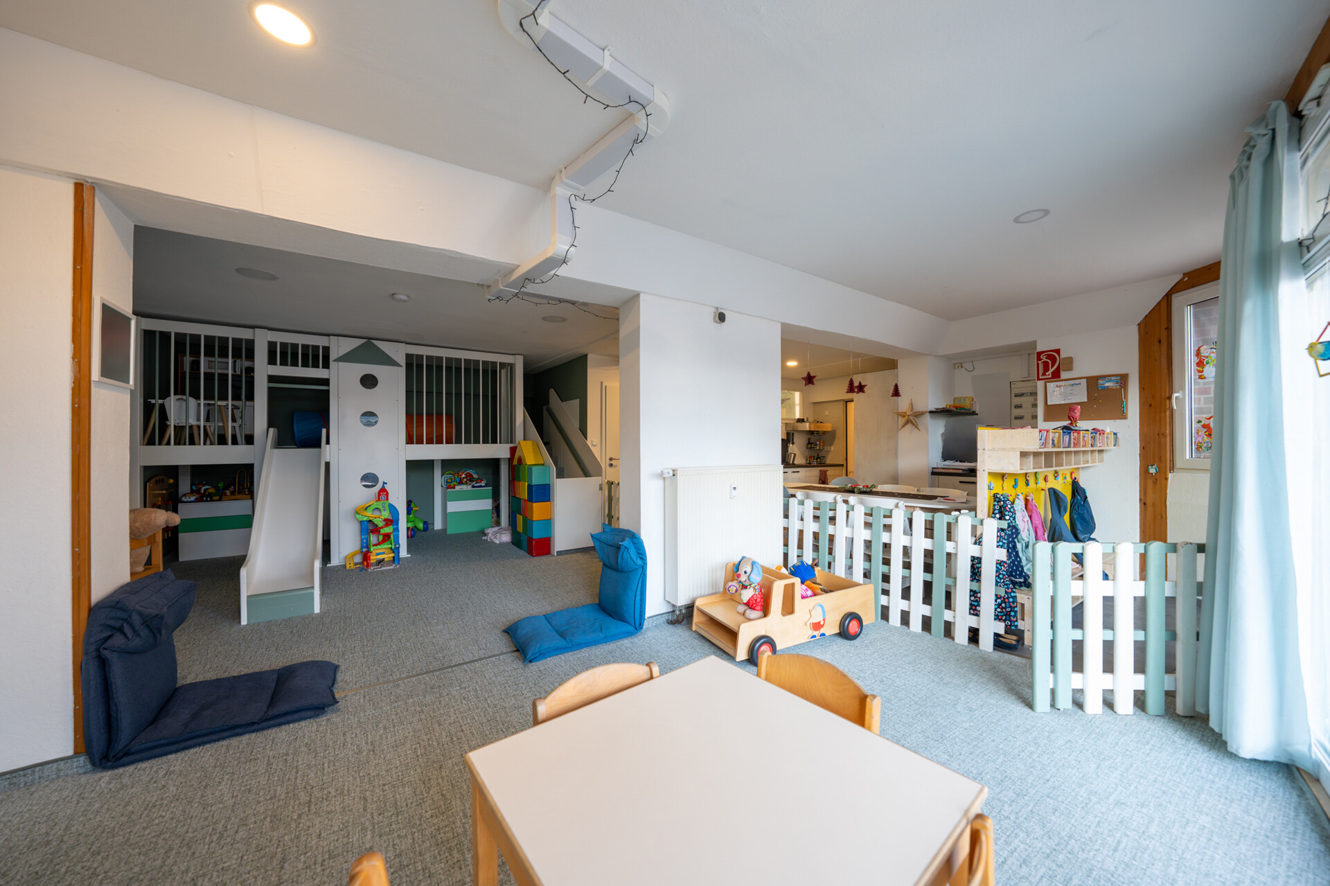 Besonders charmant ist die dazwischenliegende Kindertagesstätte mit ca. 77 m² Nutzfläche. Sie verfügt über Schlaf- und Spielbereiche und ist ideal für gewerbliche Nutzung – eine Seltenheit, die diese Immobilie so einzigartig macht.