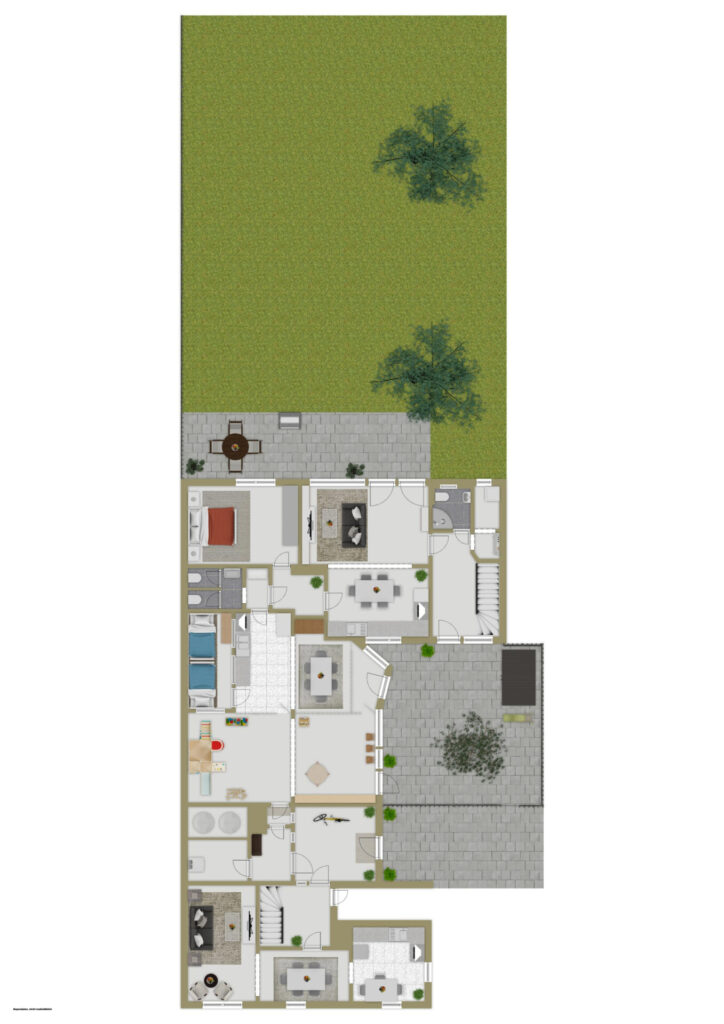 Das Vorderhaus aus dem Jahr 1930 lädt auf ca. 113 m² Wohnfläche mit vier Zimmern, darunter zwei Schlafzimmer, ein Büro sowie einem offenen Wohn- und Essbereich zum Wohlfühlen ein. Das Hinterhaus aus dem Jahr 1994 erstreckt sich über ca. 124 m² und bietet mit sechs Zimmern, darunter fünf Schlafzimmer, sowie einem hellen Wohn- und Essbereich ausreichend Platz für größere Familien oder flexible Nutzungskonzepte.