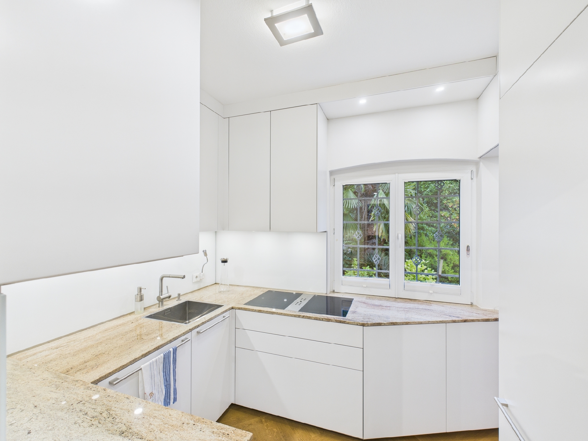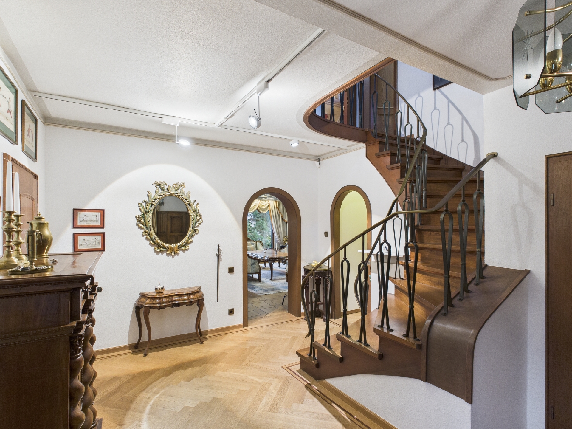Im Erdgeschoss erwartet Sie ein großzügiger Wohn-/Essbereich, der durch seine offene Gestaltung besticht. Angrenzend befindet sich eine kleine Bibliothek, die Raum für Ruhe und Inspiration bietet. Der sonnige Wintergarten erweitert den Wohnbereich harmonisch und eröffnet einen wunderbaren Blick in den Garten. Die kleine Einbauküche und das Gäste-WC ergänzen das Raumangebot. Ein großes Nebenzimmer eröffnet zusätzliche Möglichkeiten: So könnte der Raum z.B. zu einem komfortablen Eltern-Schlafzimmer mit Ankleidebereich und Bad en Suite umgebaut werden.