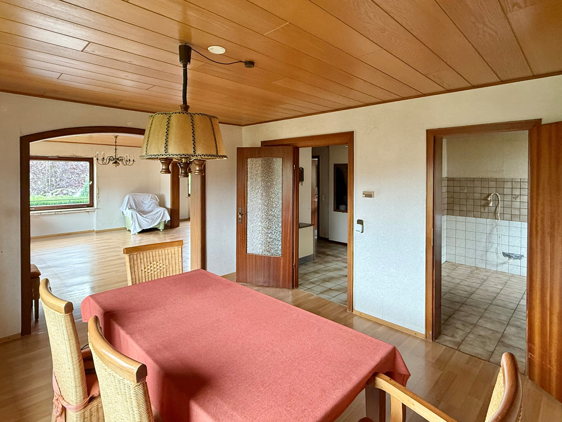 Das um 1970 erbaute Objekt überzeugt durch eine Wohnfläche von rund 155 m², verteilt auf zwei Ebenen und bietet zahlreiche Gestaltungsmöglichkeiten. Auf dem ca. 593 m² großen Grundstück finden Sie zwei Einzelgaragen und einen gepflegten Gartenbereich vor – die große Thuja im hinteren Bereich wurde inzwischen entfernt. Die Immobilie lässt sich ideal als klassisches Einfamilienhaus nutzen: Im oberen Bereich befinden sich die Hauptaufenthaltsräume wie Wohn-, Ess- und Küchenbereich. Hervorzuheben ist hier das bereits modernisierte Badezimmer mit bodentiefer, offener Dusche und altersgerechter Ausstattung. Die untere Etage bietet ausreichend Platz für Schlafzimmer und weitere Räume. Alternativ wäre das Haus mit entsprechenden Maßnahmen in zwei separate Einheiten aufteilbar. So könnten zwei eigenständige 2ZiKB Wohnungen entstehen – ideal für Mehrgenerationenwohnen, für heranwachsende Kinder oder auch zur Vermietung. So eignet sich das Haus sowohl für Familien, die viel Raum benötigen, als auch für Paare oder ältere Personen, die Wert auf eine altersgerechte Nutzung legen. Dank des vorhandenen Balkons sowie der überdachten Terrasse mit angrenzendem Wintergarten bietet die Immobilie außerdem schöne Rückzugsorte.