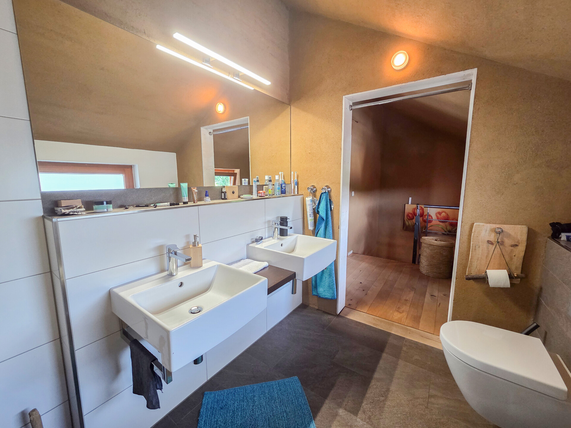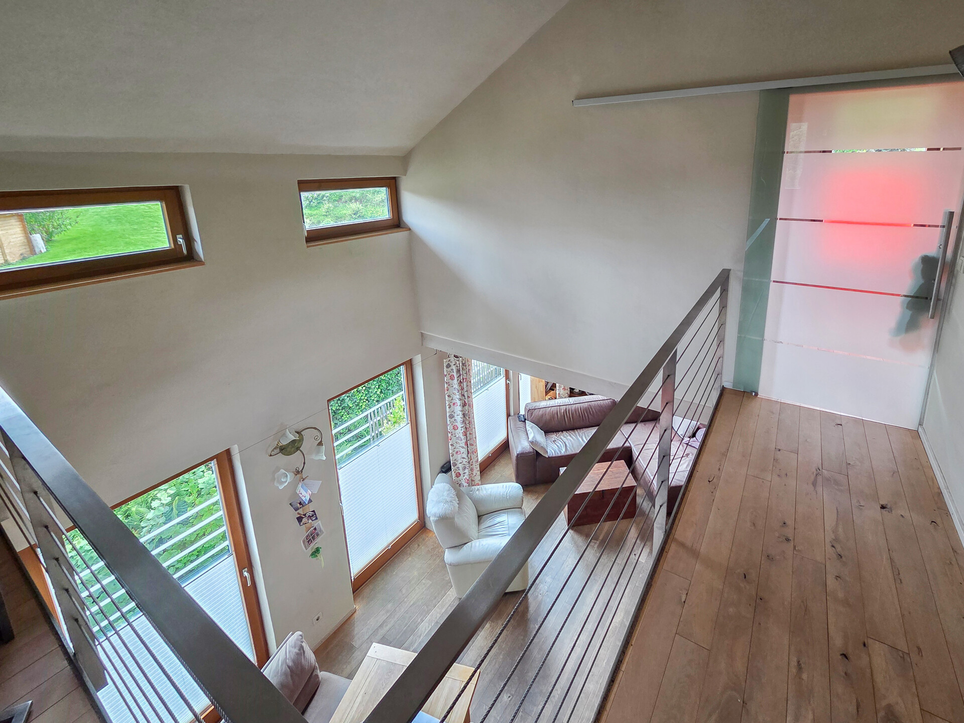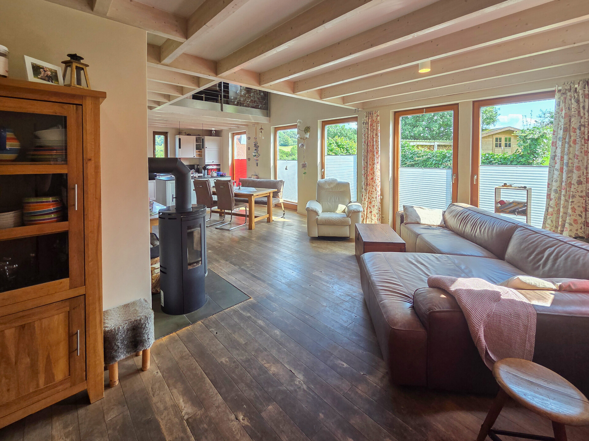 Das Haus wurde 2000 in ökologischer Holzständerbauweise errichtet, mit Holzfaserdämmplatten gedämmt und bietet ca. 177 m² Wohnfläche mit offen gestalteten Räumen, freiliegenden Balken, einer offenen Galerie und viel natürlichem Licht. Für ein gesundes Wohnklima sorgen 3 cm starker Lehm- und Marmormehlputz. Ein Kaminofen im Wohnzimmer sowie hochwertige Echtholzböden aus Buche schaffen eine warme, einladende Atmosphäre.