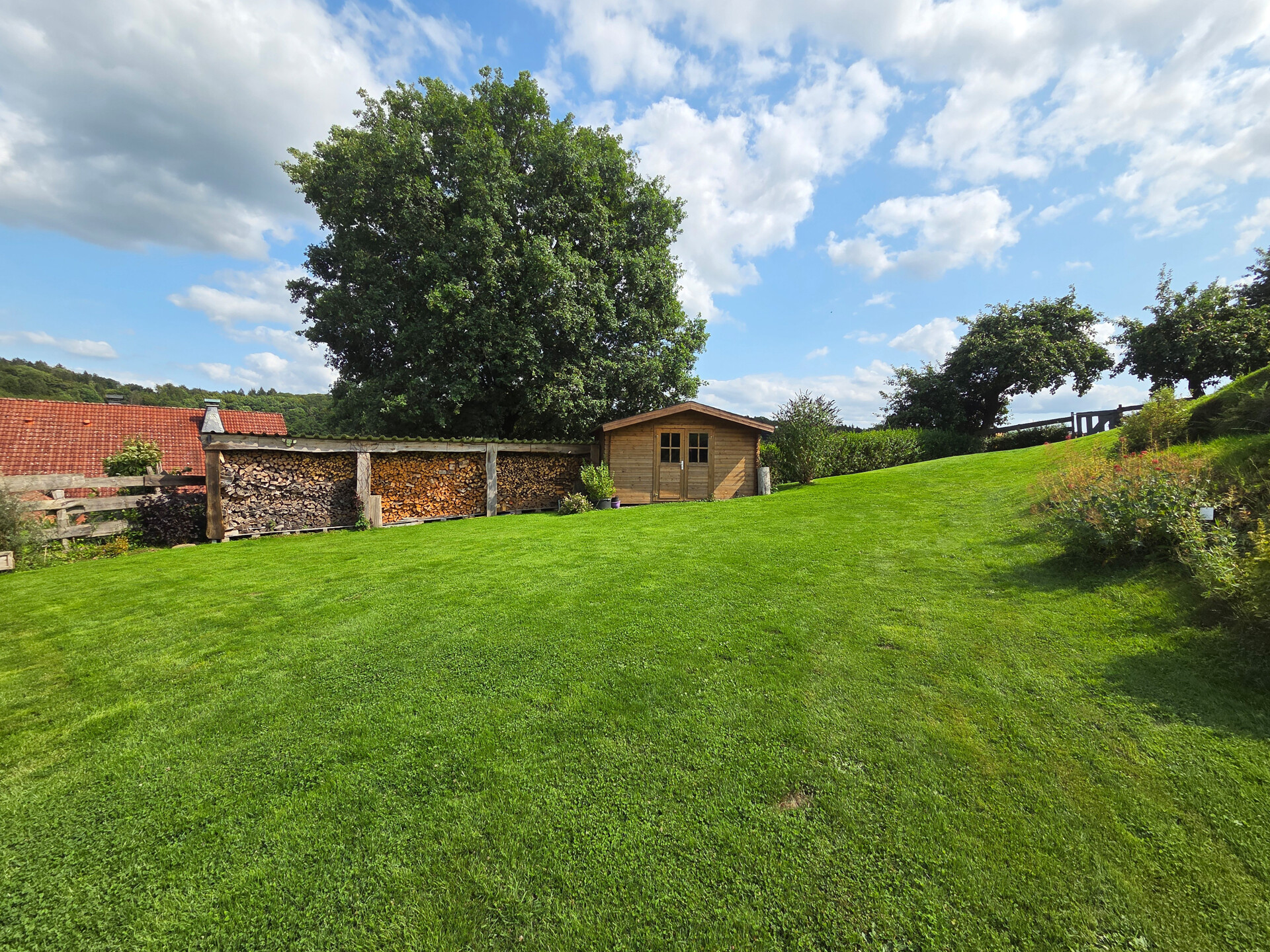 Die Highlights im Außenbereich: das weitläufige Grundstück, eine große, teils überdachte Terrasse mit herrlichem Blick ins Grüne, zwei Balkone, eine Hollywoodschaukel mit Ausblick, zwei Schuppen, ein Holzlager sowie eine 6.000 l Regenwasserzisterne. Ein Doppelcarport steht ebenfalls zur Verfügung.