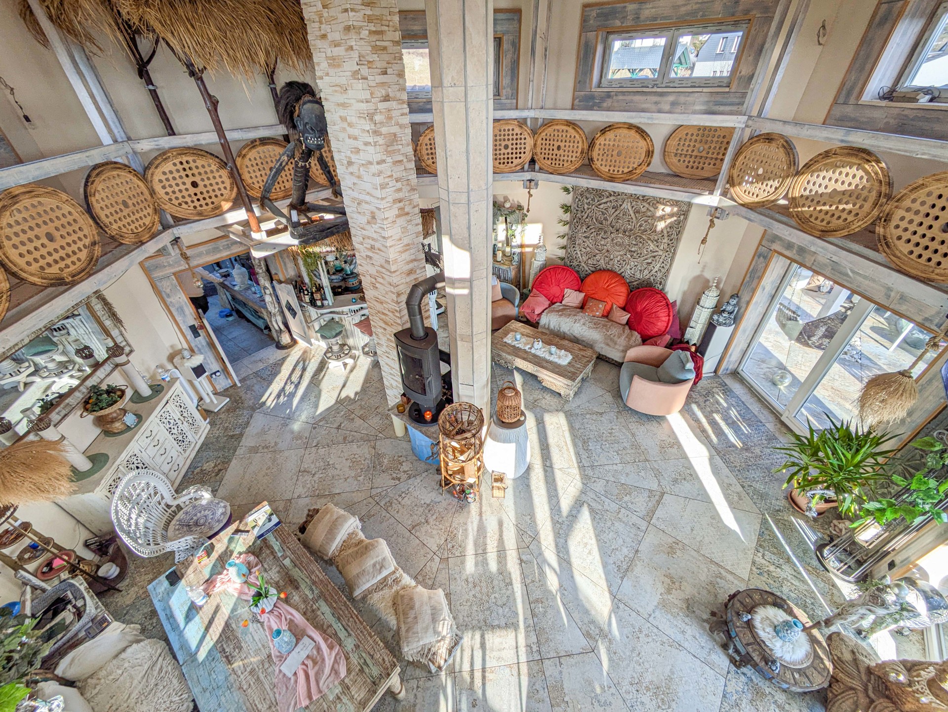 – Offenes Wohnkonzept mit hohen Decken und rustikalen Holzelementen