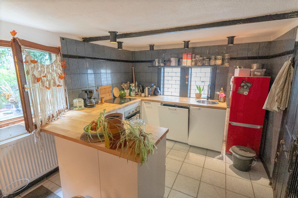 Das Herzstück des Hauses ist der offene Wohn-/, Ess-/ und Küchenbereich im Erdgeschoss. Ein großer Kaminofen spendet hier wohlige Wärme, während die freiliegenden Fachwerkbalken eine unverwechselbare Atmosphäre schaffen urig, behaglich und voller Charakter.