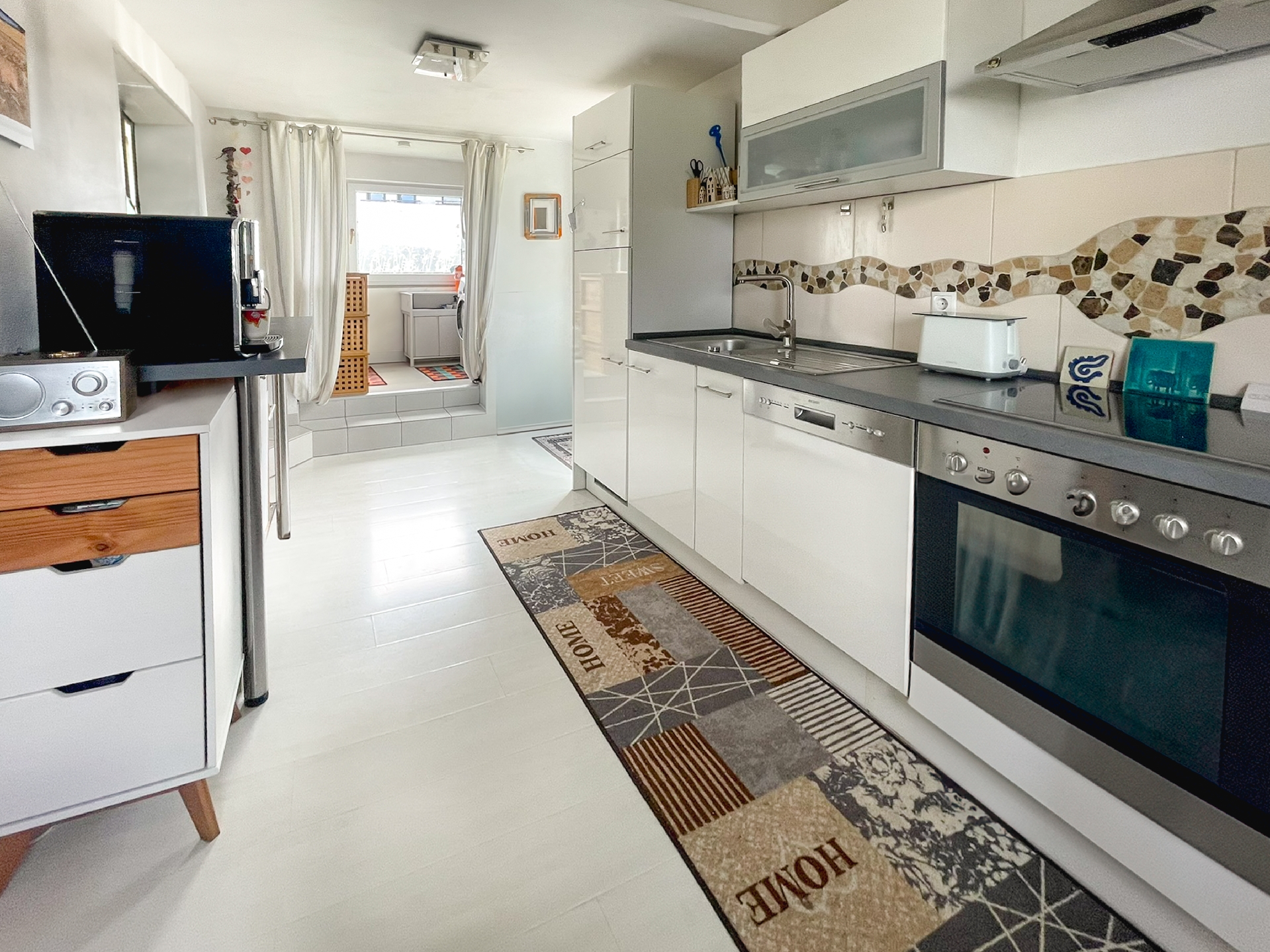 Weiter geht es in die Küche, die mit einer Einbauküche ausgestattet ist und genügend Platz für einen Essbereich bietet. Die hell gewählten Farben verleihen dem Raum eine freundliche Offenheit. Angrenzend befindet sich ein Abstellraum mit Platz für Waschmaschine, Trockner oder Vorräte.