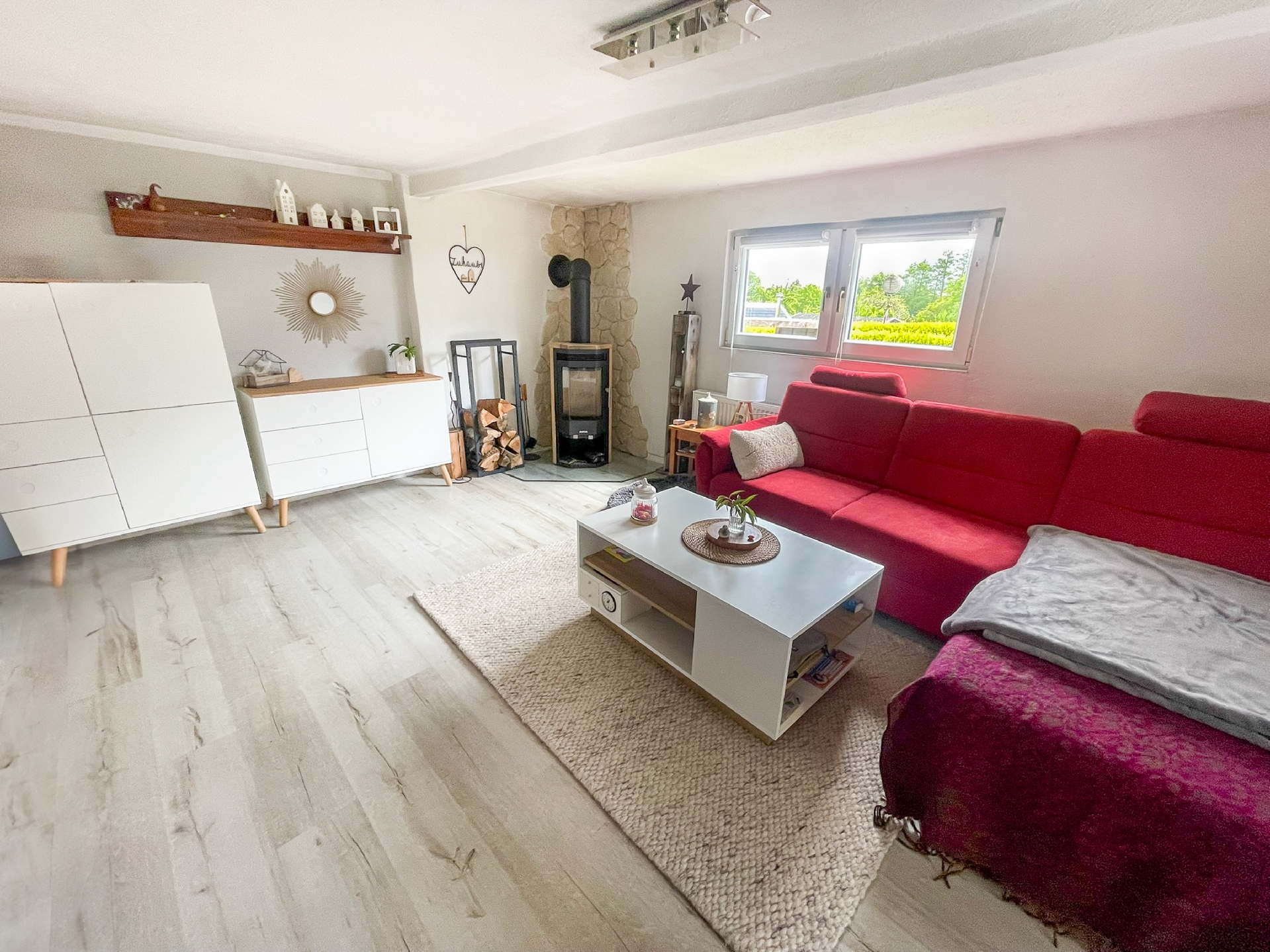 Der Durchgang parallel zur Haustür führt in das Wohnzimmer. Hier ist die Decke etwas niedriger. Ein Kamin aus dem Jahr 2017 sorgt zusätzlich für Wärme und eine gemütliche Atmosphäre.