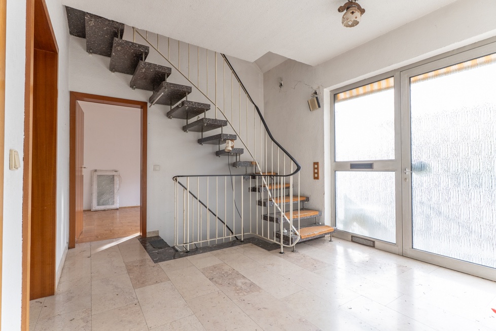 Zurück im Erdgeschoss gelangen Sie zunächst in den zentralen Eingangsbereich mit Garderobennische sowie dem Treppenaufgang ins Dachgeschoss und zum Keller. Herzstück dieser Immobilie ist das ca. 44 m² große, offen gestaltete