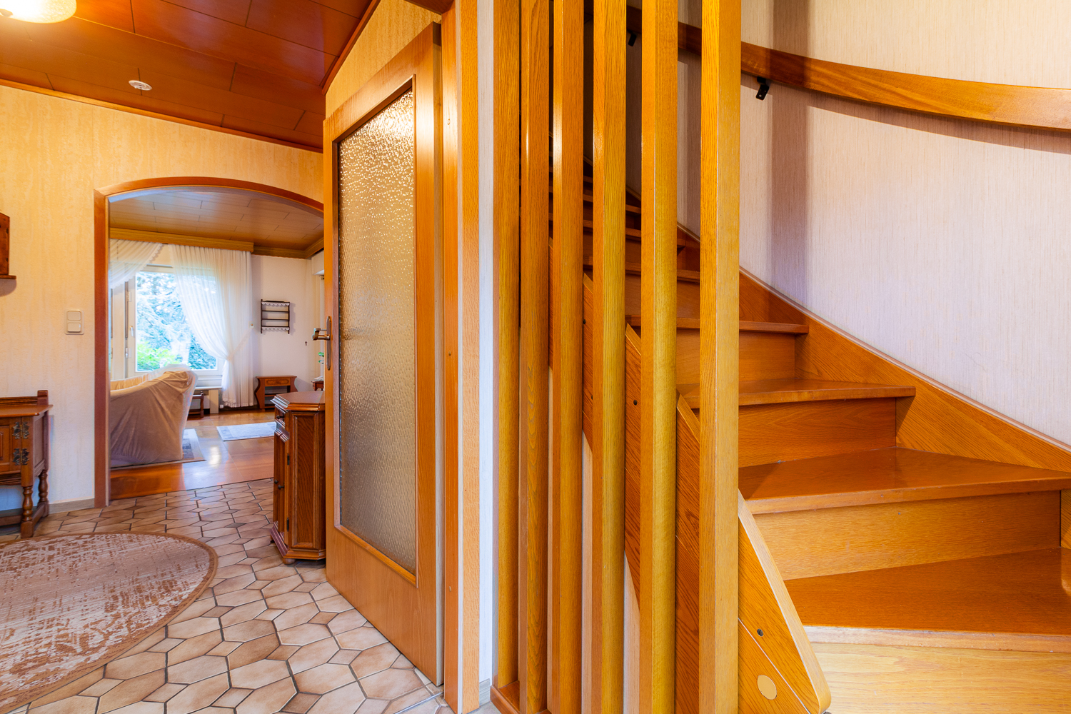 Beim Betreten des Hauses gelangen Sie durch den Windfang in eine großzügige Diele, die als zentraler Mittelpunkt dient. Im vorgelagerten Windfang finden Sie das Gäste-WC und die bereits vorhandene Treppe ins derzeit ungenutzte Dachgeschoss.