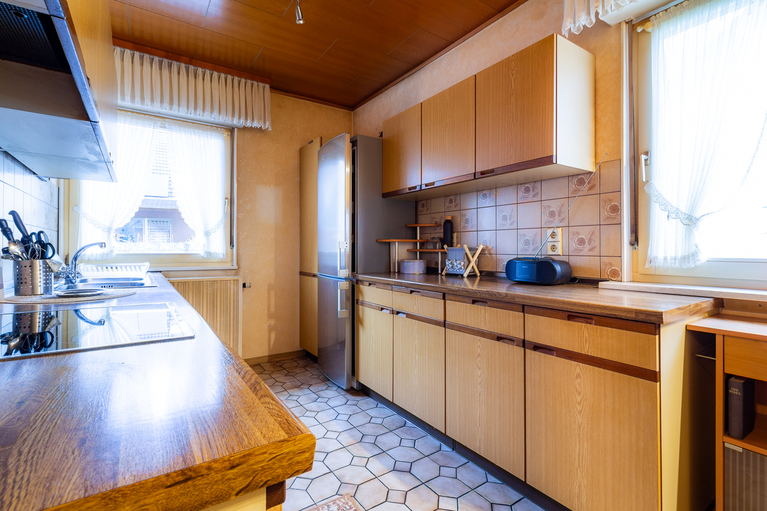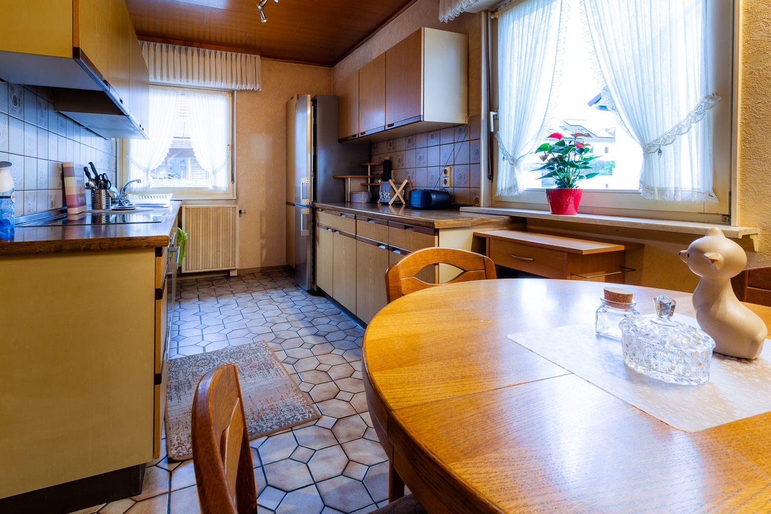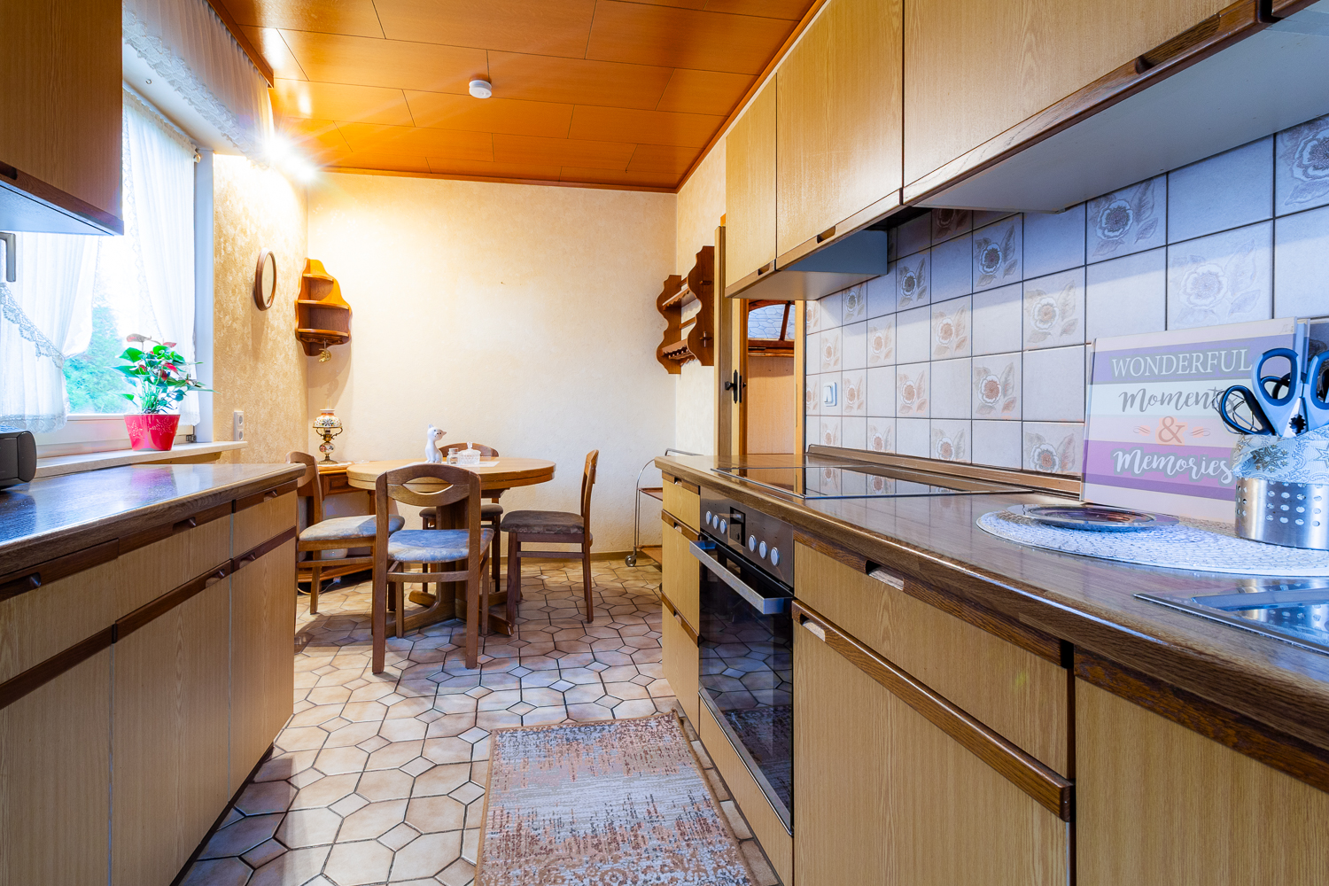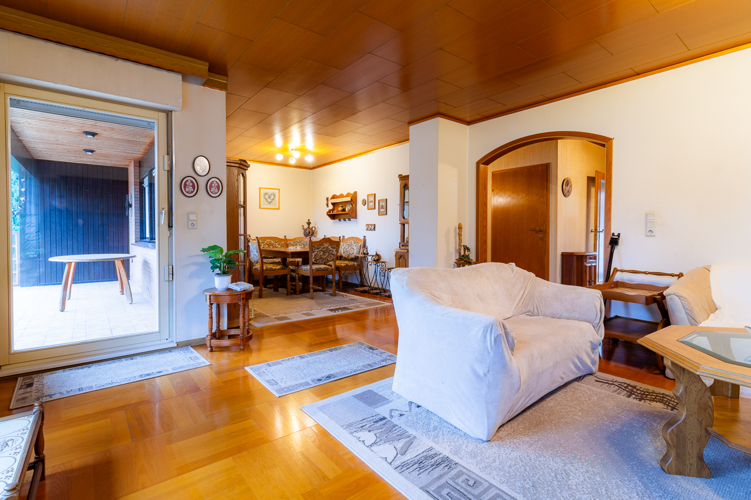Von der Diele aus öffnet sich der geräumige Wohn- und Essbereich. Große Fensterflächen sorgen für reichlich Tageslicht und einen schönen Blick ins Grüne. Von hier aus gelangen Sie auch auf die teilüberdachte Terrasse – perfekt für den ersten Kaffee am Morgen, das Sonnenbaden am Mittag oder dem Entspannen am Abend. Aufgrund der vorhandenen Raumstruktur bietet sich die Umgestaltung zu einer offenen Wohnküche an: So kann ein moderner, offener Lebensmittelpunkt entstehen, in dem Kochen, Essen und Wohnen harmonisch ineinander übergehen.