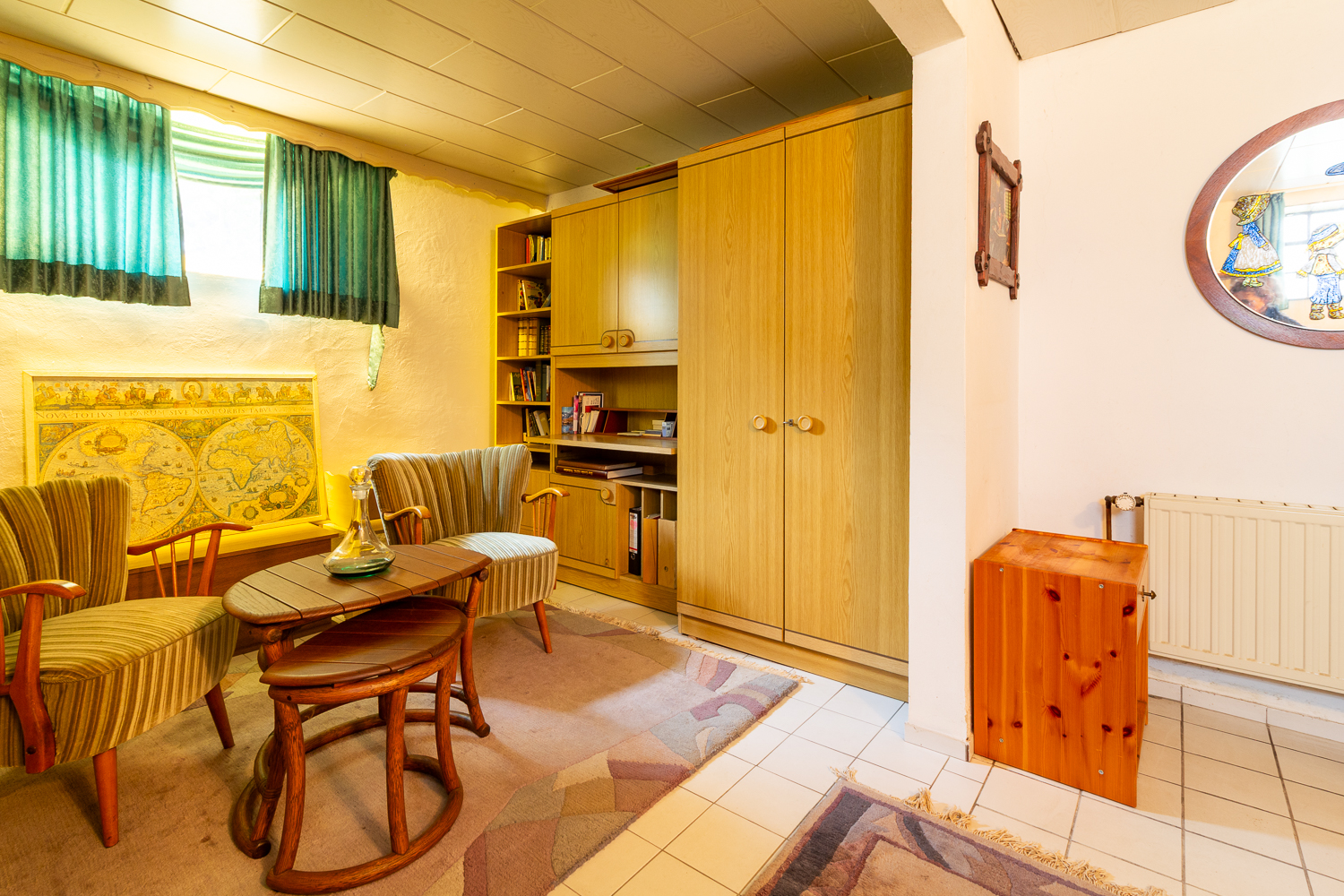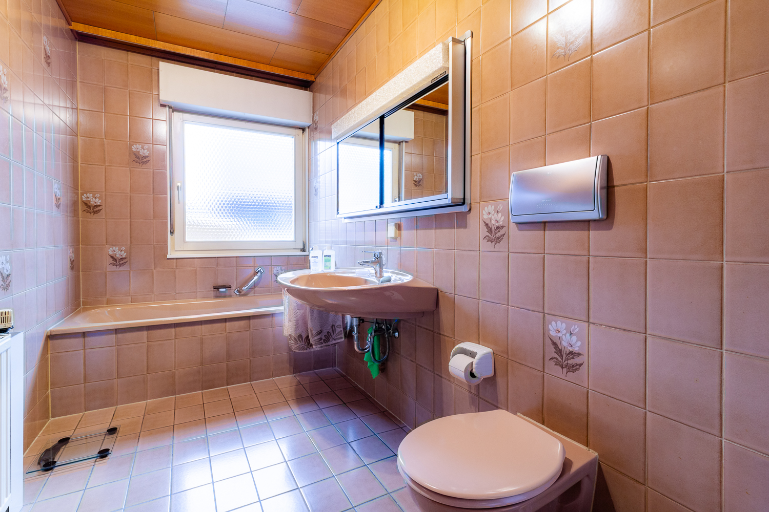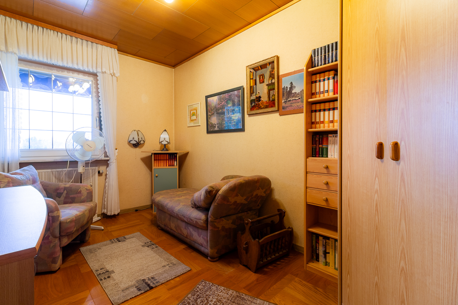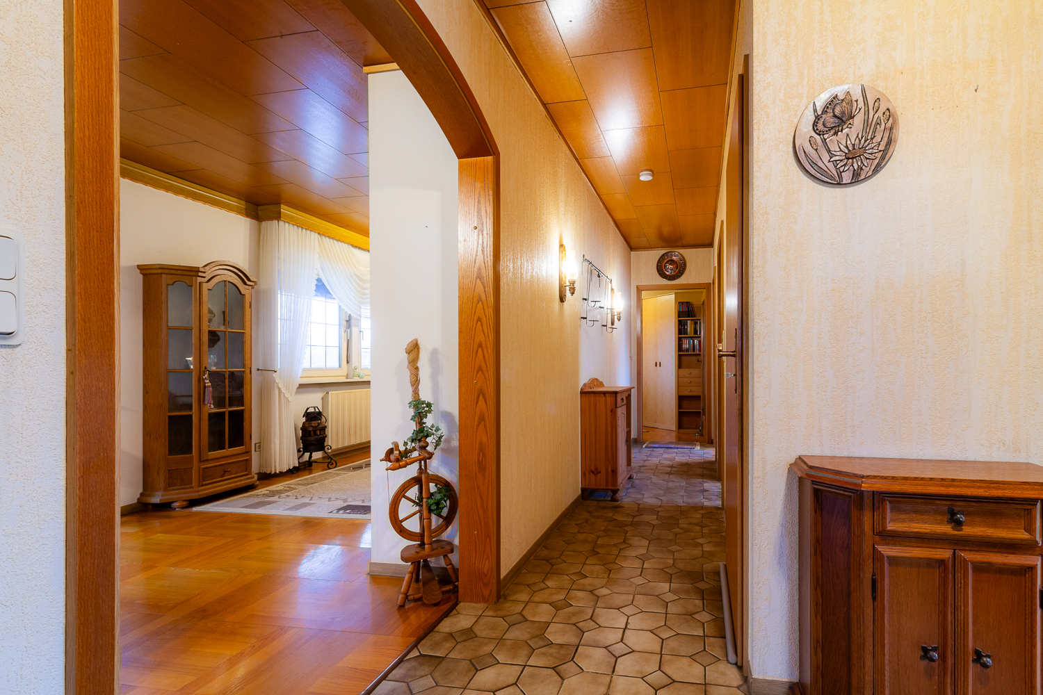 Der Flur im Erdgeschoss führt in den privaten Bereich des Hauses. Hier befinden sich zwei gut geschnittene Zimmer, die flexibel als Schlafzimmer, Kinderzimmer oder Homeoffice genutzt werden können. Ein Tageslichtbad mit Badewanne komplettiert das Raumangebot auf dieser Wohnebene.