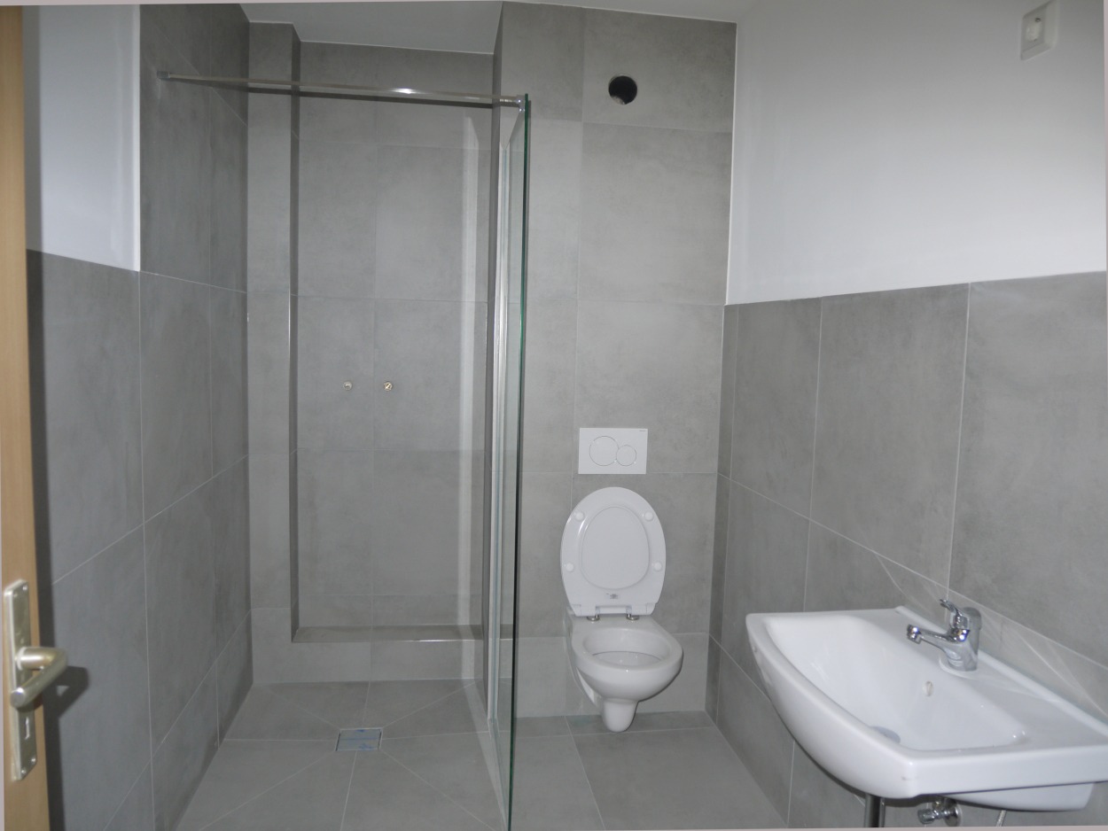 Das Innenliegende Badezimmer ist dunkel grau gefliest und mit einer Dusche ausgestattet.