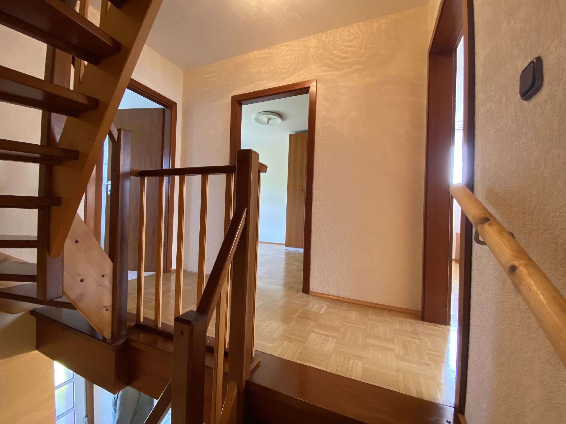 Über eine offene Treppe gelangen Sie in das erste Obergeschoss. Hier erwarten Sie ein außergewöhnlich großes Schlafzimmer, ein Kinderzimmer und das hell geflieste Tageslichtbad mit Wanne. In der ursprünglichen Planung war eine Unterteilung des großen Schlafzimmers angedacht. Dies wäre auch heute mit wenig Aufwand noch umsetzbar.