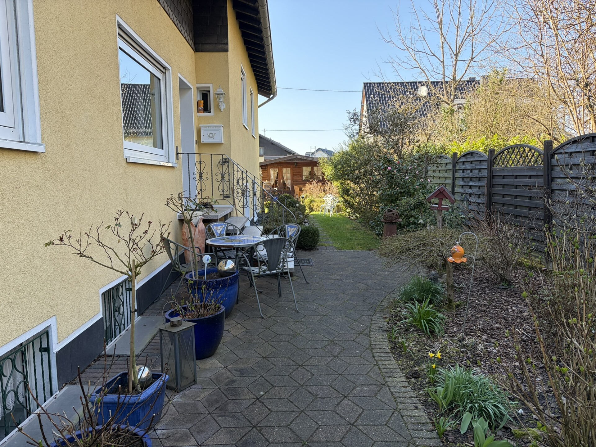 Der liebevoll angelegte und mit einer Hecke eingefriedete Garten ist in zwei Ebenen unterteilt, sodass sowohl die Hausbewohner als auch die Mieter ausreichend Privatsphäre genießen können. Beide Terrassen sind mit Markisen ausgestattet. Ein geräumiges Gartenhaus mit überdachter Terrasse lädt zu geselligen Abenden im Freien ein.