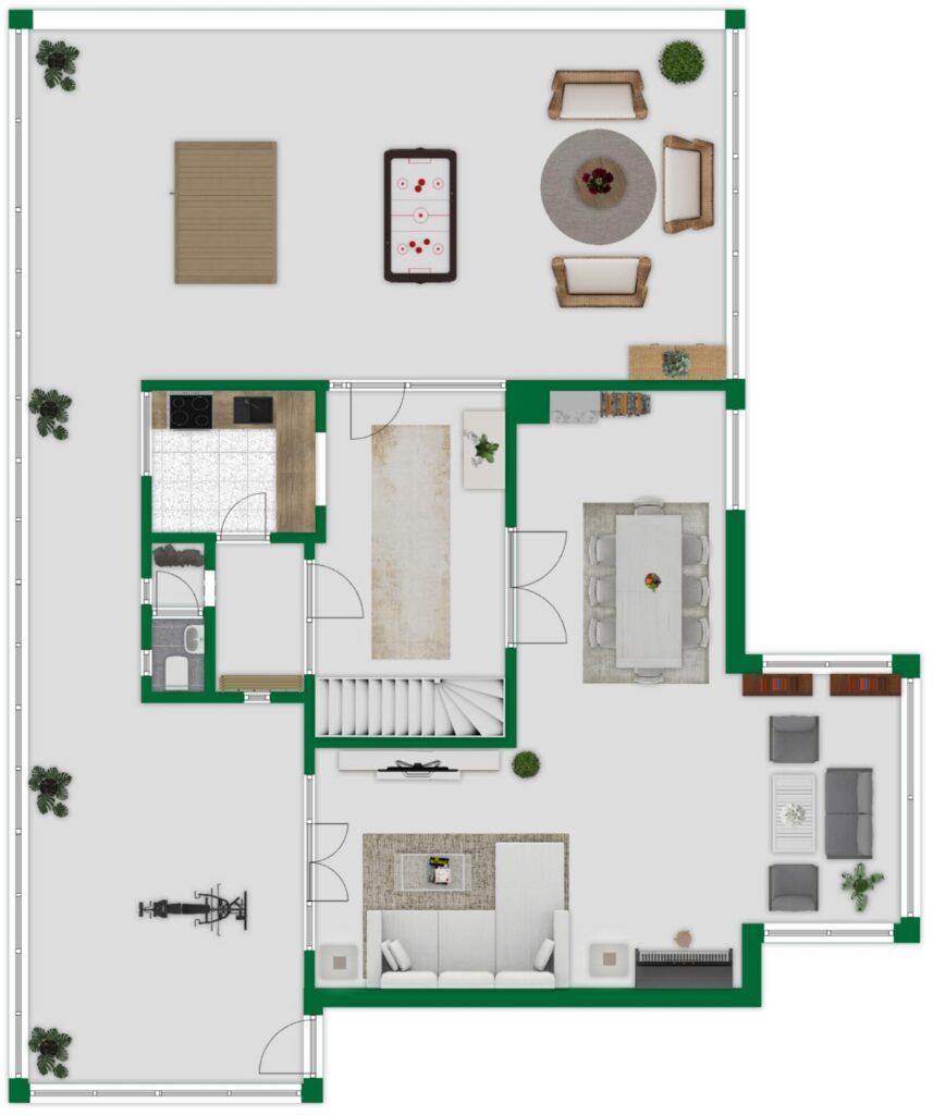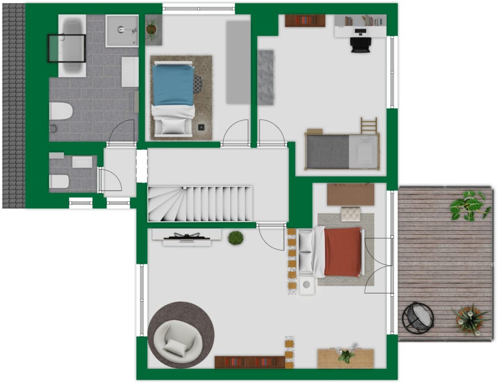 Die Terrassenflächen im Erdgeschoss umfassen insgesamt rund 120 m². Eine auf der Terrasse platzierte Fass-Sauna ist bereits im Kaufpreis enthalten und unterstreicht den besonderen Wohnkomfort.
