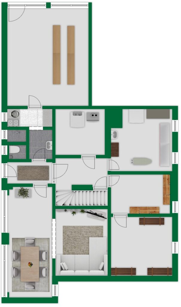 Durch die Hanglage ist das Gebäude in ein Gartengeschoss, ein Erdgeschoss auf Straßenniveau sowie ein Obergeschoss gegliedert. Das Gartengeschoss öffnet sich ebenerdig zum Garten und bietet einen großen Raum, der sich ideal als Büro, Hobbyraum oder Gästezimmer eignet. Ergänzt wird diese Ebene durch ein WC, eine Dusche und eine Kochnische. Ein weiterer Raum entstand durch die Umnutzung einer ehemaligen Garage und wurde mit einer großzügigen Fensterfront und Tür ausgestattet. Zusätzlich befinden sich auf dieser Ebene zwei Garagen, ein Heizungskeller, eine Waschküche, zwei Abstellräume sowie ein Flur mit Treppe ins Erdgeschoss.