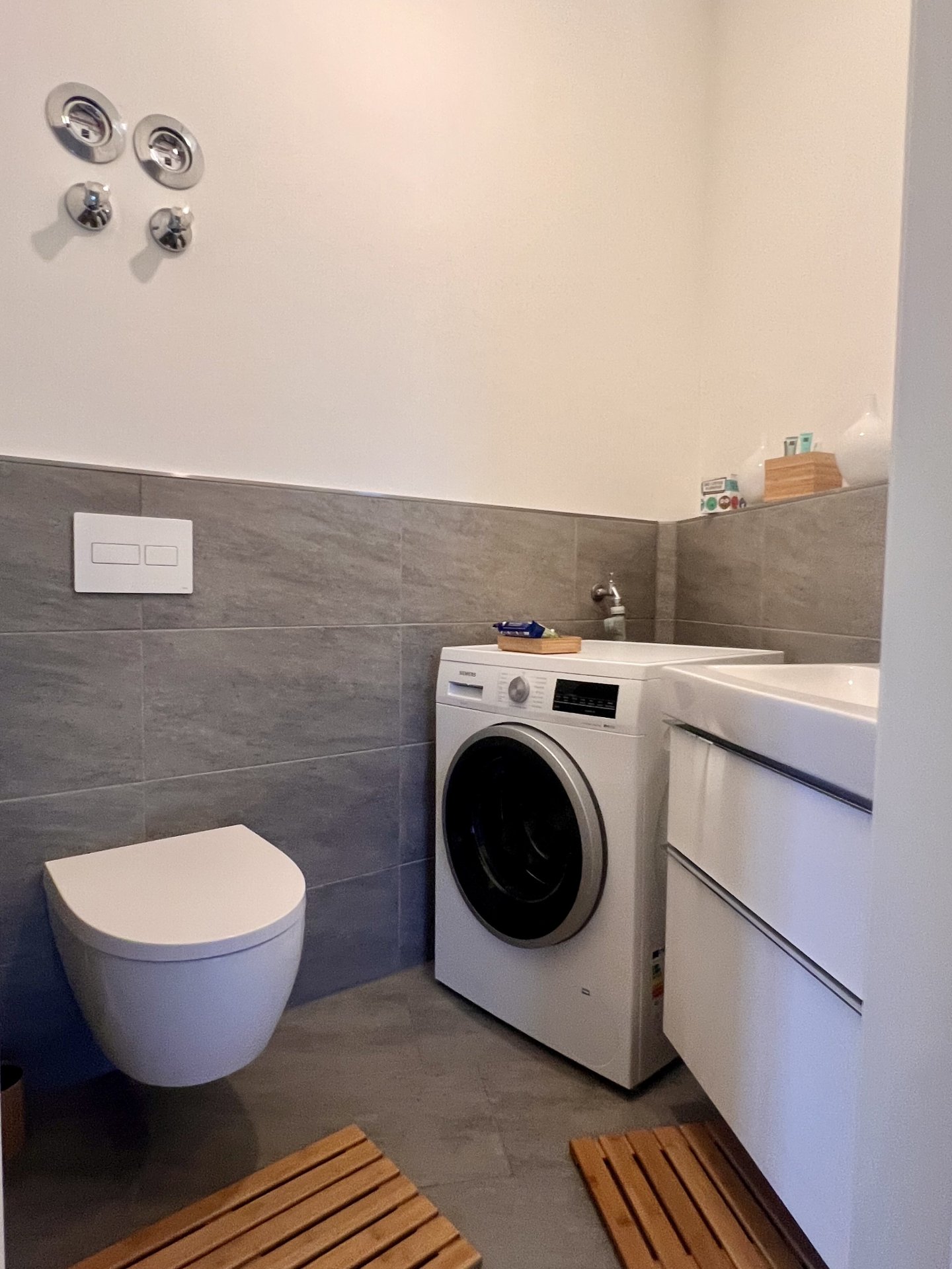 Das modern gestaltete Duschbad ist funktional ausgestattet und verfügt über eine großzügige Dusche. Zusätzlich steht ein separates Gäste-WC zur Verfügung in welchem sich der Waschmaschinenanschluss befindet.