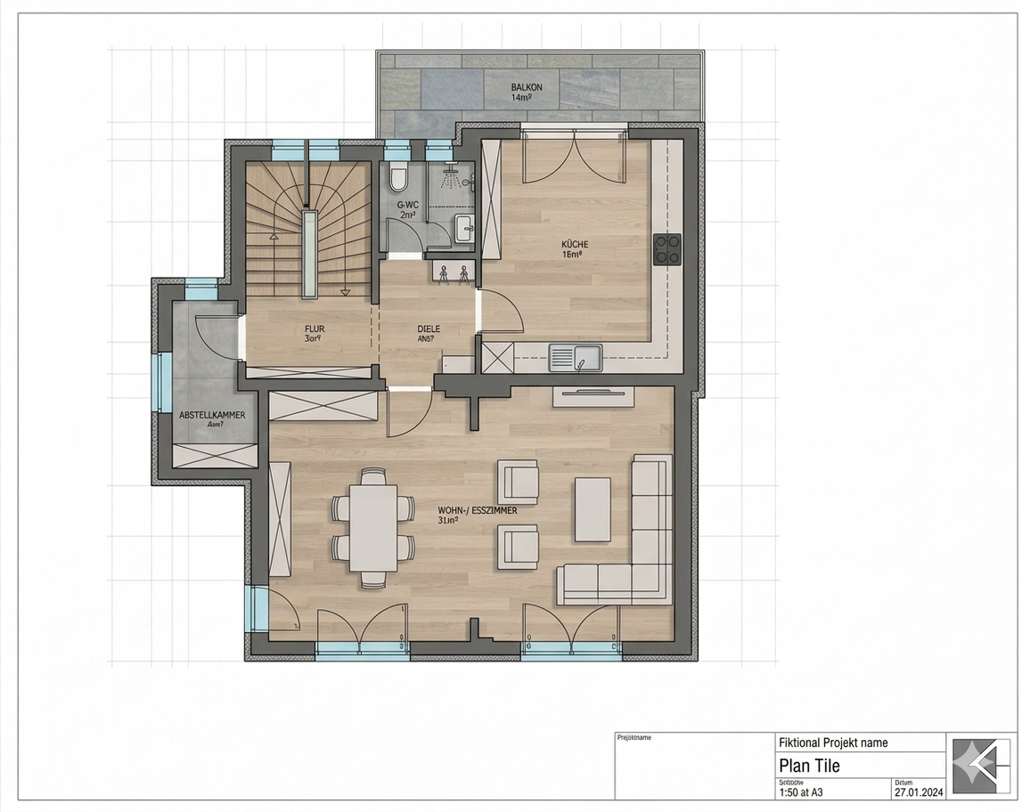 Beim Betreten der Wohnung empfängt Sie ein Eingangsbereich mit Garderobe, Abstellkammer sowie Zugang zur Diele im 1. Obergeschoss und zum Treppenaufgang in das 2. Obergeschoss.