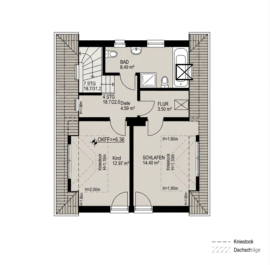 Über die Treppe im Eingangsbereich gelangen Sie in das 2. Obergeschoss. Die Diele auf dieser Ebene bietet Platz für einen kleinen Arbeitsbereich und erschließt alle weiteren Räume sowie den Zugang zum Spitzboden, der zusätzliche Abstellfläche zur Verfügung stellt.