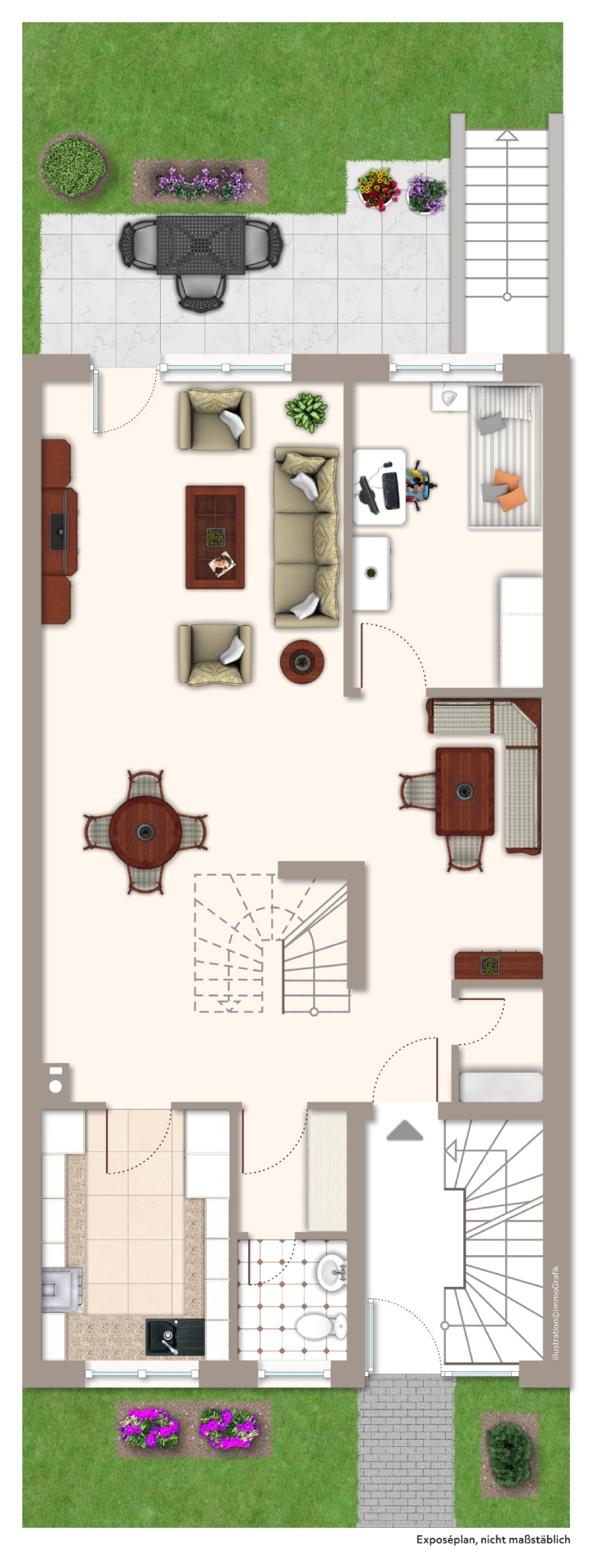 Willkommen in Ihrem neuen Zuhause – einer großzügigen 3-Zimmer-Wohnung, die mit 99 m² Wohnfläche viel Raum für Ihre individuellen Gestaltungsideen bietet. Diese charmante Wohnung erstreckt sich über das Erdgeschoss und Obergeschoss eines gepflegten Reihenmittelhauses, welches im Jahr 1979 erbaut wurde. Betreten Sie die Wohnung und lassen Sie sich von der hellen und freundlichen Atmosphäre verzaubern. Die großzügigen Zimmer bieten Ihnen viel Platz, um Ihre Wohnträume zu verwirklichen. Ob gemütliches Wohnzimmer, stilvolle Schlafzimmer oder ein gemütliches Kinderzimmer – hier finden Sie die perfekte Balance zwischen Funktionalität und Komfort. Ein besonderes Highlight ist die einladende Terrasse, die Ihnen die Möglichkeit bietet, entspannte Stunden im Freien zu genießen. Stellen Sie sich vor, wie Sie an warmen Sommerabenden mit Freunden grillen oder einfach nur die Sonne auf Ihrer eigenen kleinen Oase genießen. Zusätzlich zur Wohnfläche stehen Ihnen ein Keller und eine Garage zur Verfügung, die Ihnen ausreichend Stauraum für Ihre persönlichen Dinge bieten. Die Wohnung wartet darauf, von Ihnen mit Leben gefüllt zu werden. Nutzen Sie die Chance, Ihren individuellen Stil und Ihre persönlichen Akzente in diesem Raum zu verwirklichen. Diese Wohnung ist ideal für all jene, die das Leben in einer ruhigen, aber dennoch zentralen Lage schätzen. Lassen Sie Ihrer Kreativität freien Lauf und gestalten Sie Ihr neues Zuhause nach Ihren Wünschen!