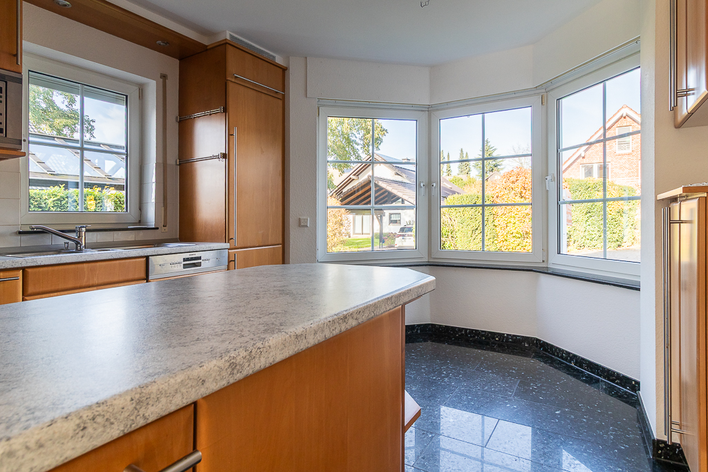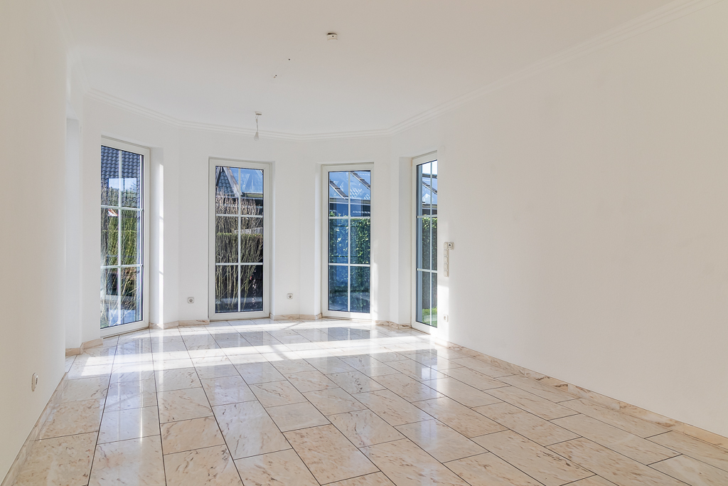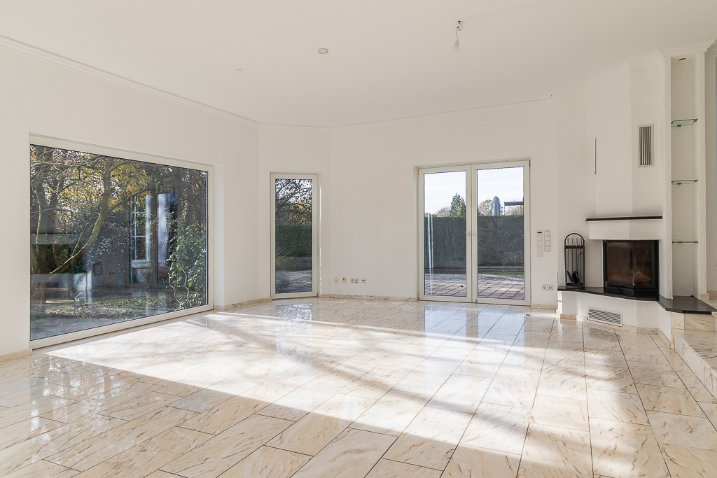 Beim Betreten des Erdgeschosses eröffnet sich eine großzügige Diele, die mit ihrer Geschosshöhe mit Blick auf die Galerie und den eleganten Marmorboden sofort beeindruckt. Durch eine doppelflügelige Holztüre mit Glaseinsatz eröffnet sich der Blick durch das großzügige Wohnzimmer hindurch hinaus in den Garten und das angrenzende Naturschutzgebiet. Die zahlreichen bodentiefen Fenster in Wohn- und Esszimmer tauchen den ganzen Bereich in ein warmes, natürliches Licht, während ein stilvoller Kamin angenehme Stunden der Gemütlichkeit verspricht. Das Wohnzimmer und das halb-offene angrenzende, geräumige Esszimmer sind ebenfalls mit Marmorboden ausgelegt. Die komplett ausgestattete Einbauküche bietet genug Platz und die perfekte Atmosphäre für gesellige Zusammenkünfte. Abgerundet wird das Erdgeschoss durch ein elegantes Gäste-WC, das mit hochwertigen Materialien überzeugt und den Komfort für Besucher unterstreicht.