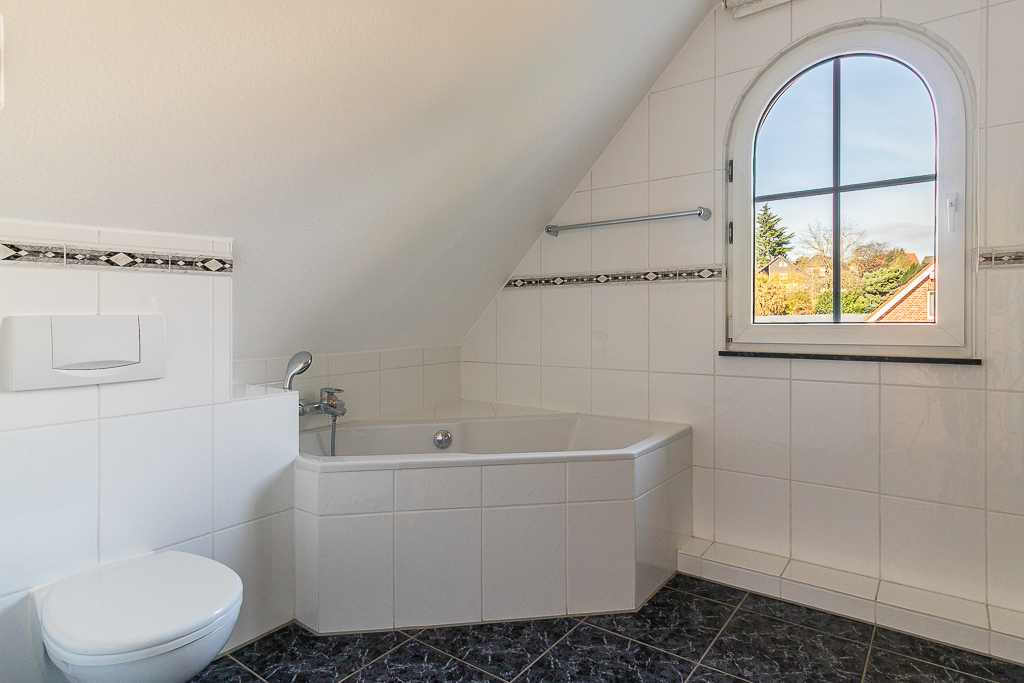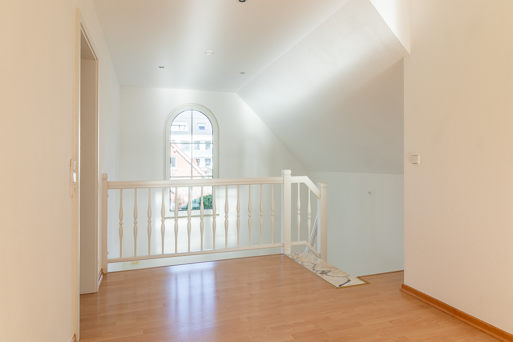 Der über eine Auszugstreppe erreichbare Dachboden ist mit seinen zwei Fenstern und Einbauschränken vollständig ausgebaut und bietet sich als Büro oder weiteres Spielzimmer an.