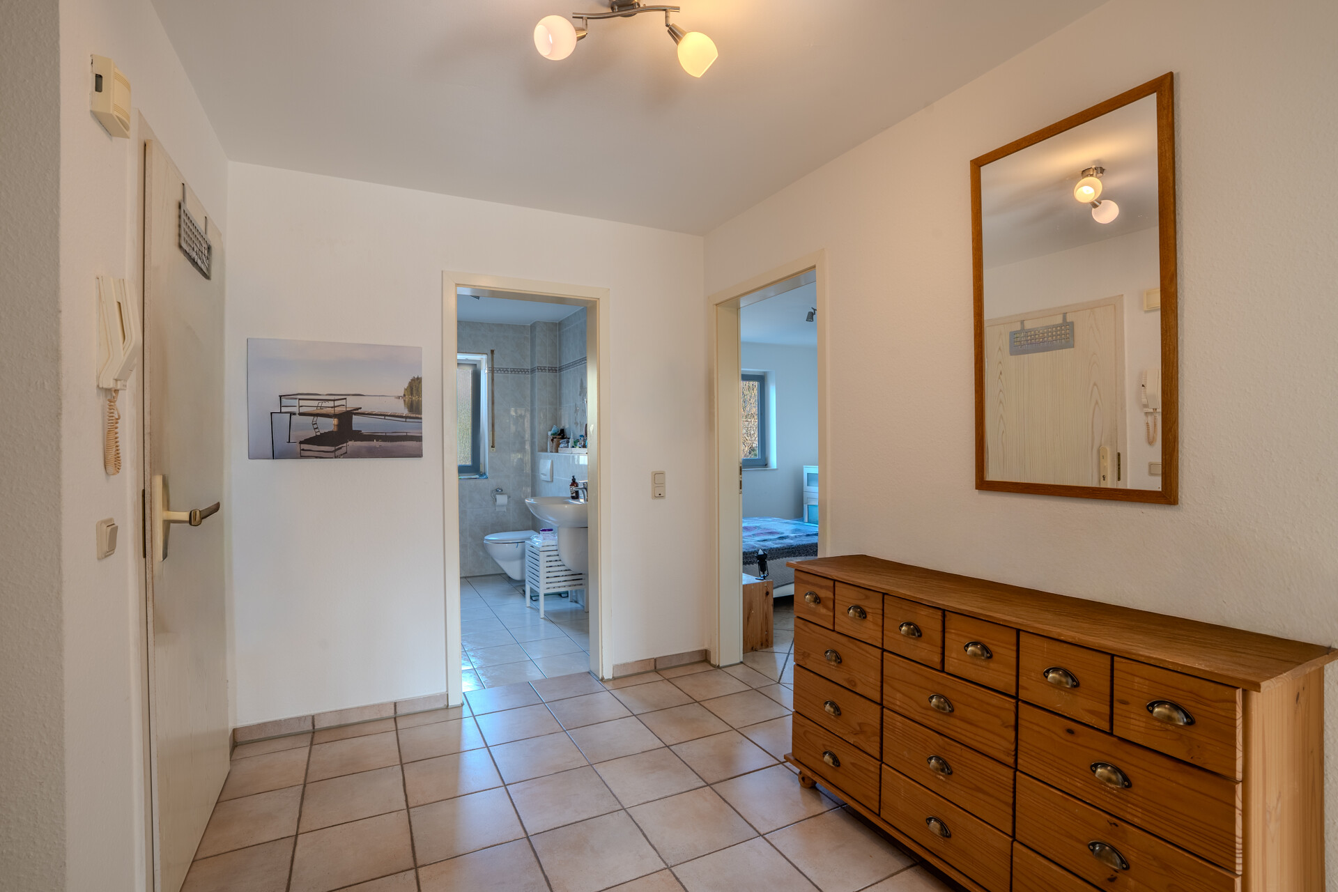 Das Badezimmer ist funktional ausgestattet. Zusätzlich steht Ihnen ein separater Trocken- und Waschraum im Haus zur Verfügung.