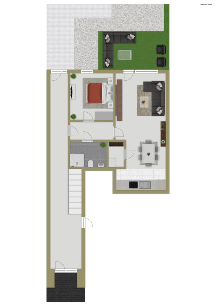– 2 Zimmer (Flur, Schlafzimmer, offener Wohn-, Ess- und Kochbereich)