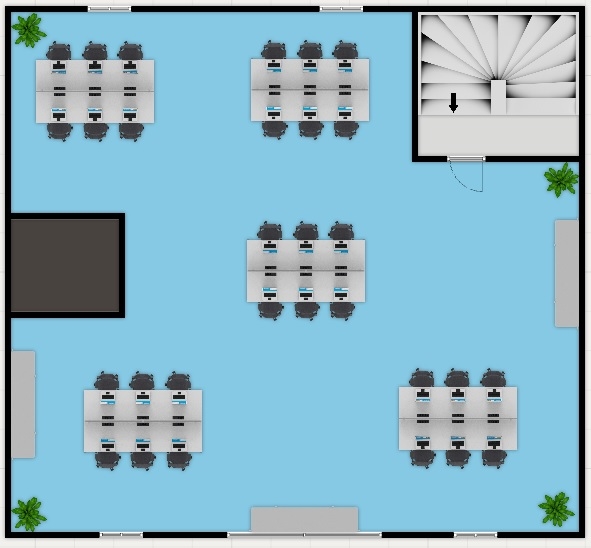 Zusammengefasst wirkt der Büroraum modern, geräumig und hell, mit einer ausgewogenen Mischung aus rustikalen und industriellen Elementen.