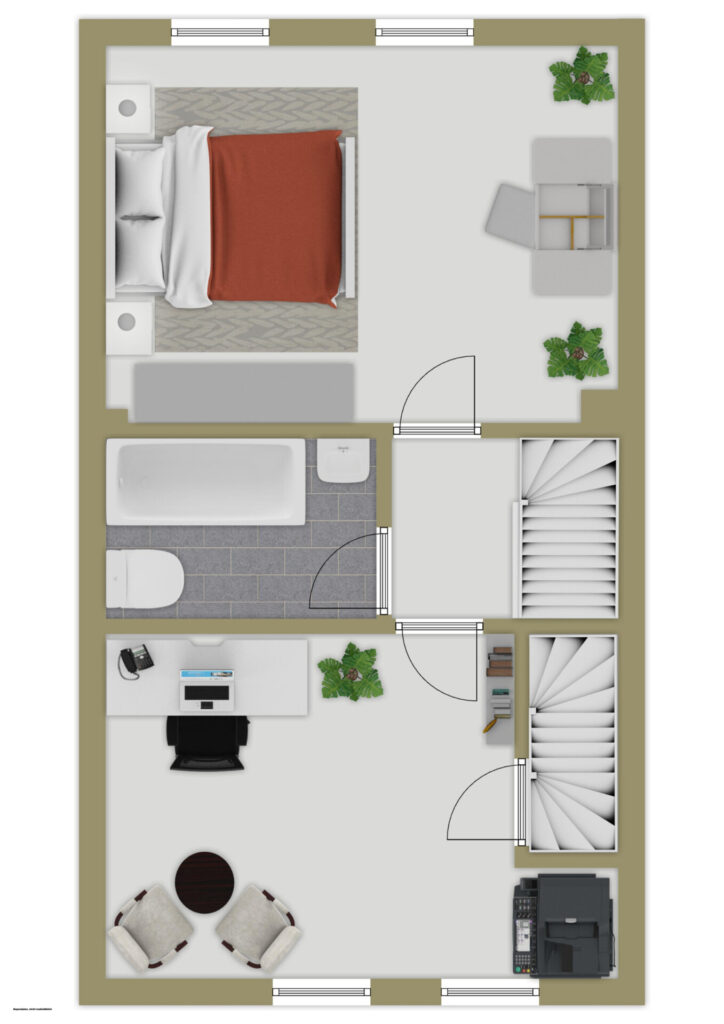 Im Obergeschoss erwarten Sie ein innenliegendes Badezimmer mit Badewanne sowie das großzügige Hauptschlafzimmer in ruhiger Lage. Ein weiteres flexibel nutzbares Zimmer eignet sich ideal für ein Büro, ein Hobby oder Gäste und ist direkt mit dem Dachgeschoss verbunden – eine durchdachte Lösung für Familien oder kreative Nutzungsideen.