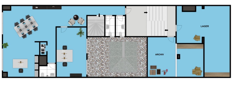 Das erste Obergeschoss bietet eine funktionale Fläche mit klarer Struktur. Neben einem abgetrennten Büro steht ein größerer Arbeitsraum zur Verfügung, der sich flexibel als Team- oder Projektfläche nutzen lässt. Zusätzlich sind auf dieser Etage ein Archiv- bzw. Lagerraum sowie getrennte Sanitäreinheiten vorhanden.