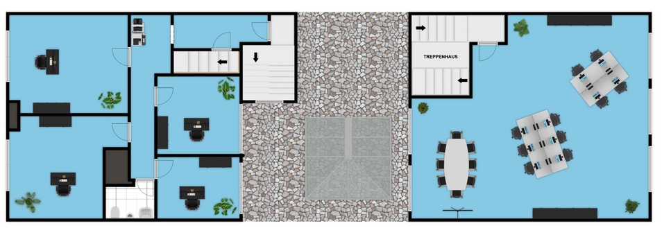 Hier stehen insgesamt sechs abgeschlossene Büroräume zur Verfügung alle mit Glastüren und Klimatisierung ausgestattet. Zwei der Räume sind größer geschnitten und verfügen über leichte Dachschrägen, was ihnen einen besonderen Charakter verleiht.