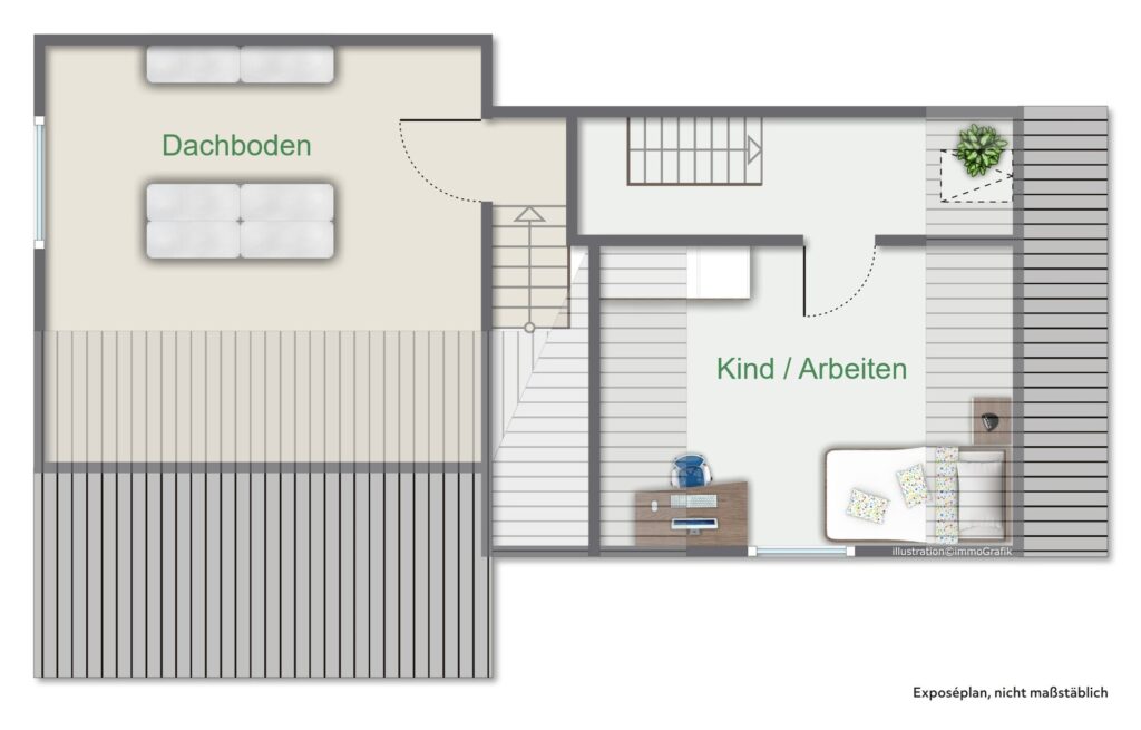 Über eine Treppe im Badezimmer gelangen Sie auf den Dachboden, der zusätzlichen Stauraum bietet. Eine weitere Treppe führt zu einem separaten Zimmer, das vielseitig nutzbar ist, beispielsweise als Gästezimmer, Arbeitszimmer oder zusätzliches Schlafzimmer.