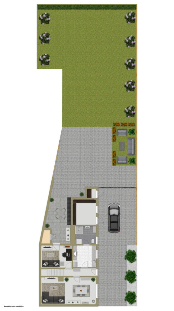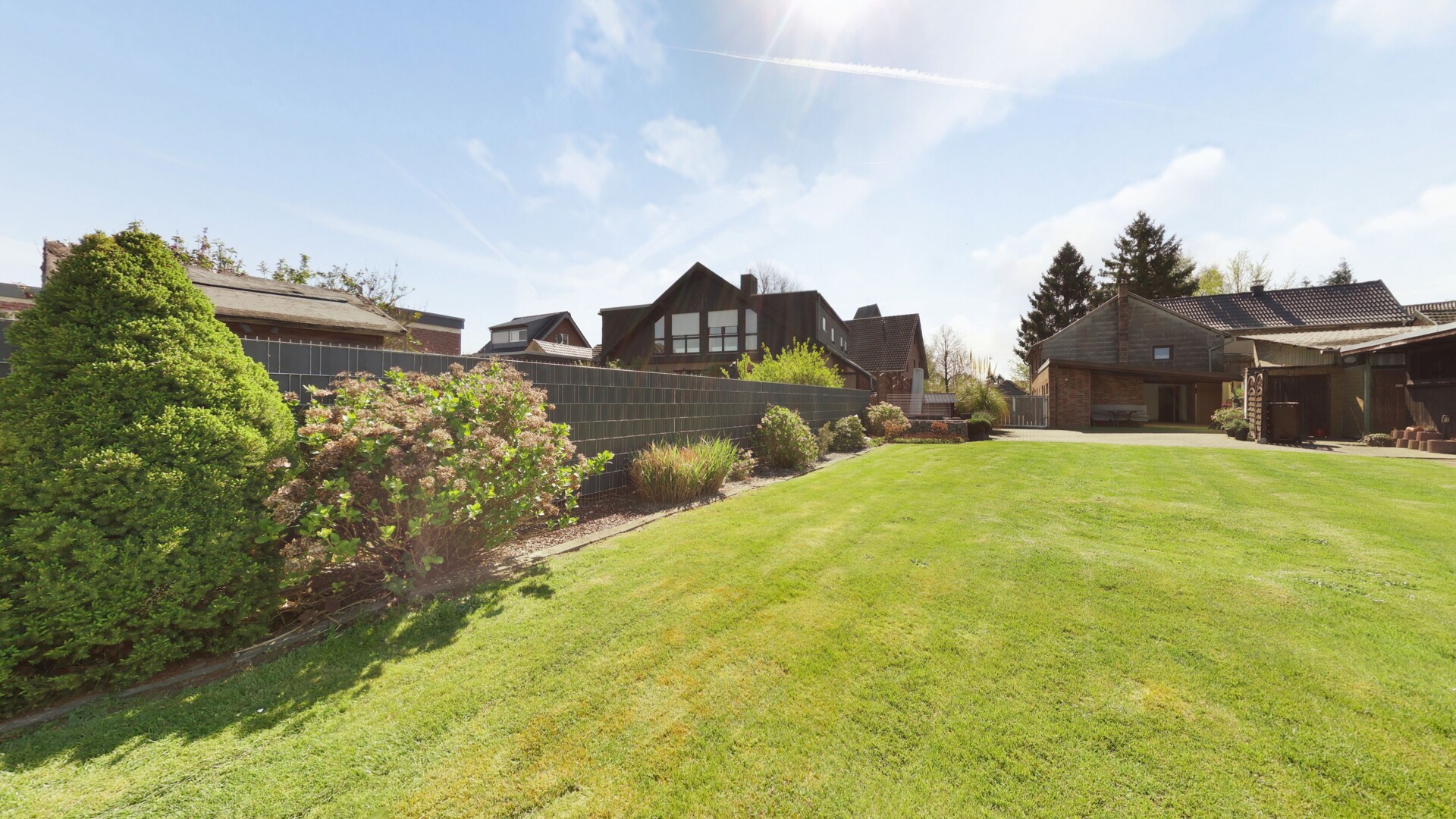 Das wahre Highlight für Familien und Hobbygärtner ist das weitläufige Grundstück. Während der gepflasterte Innenhof mit gemütlichem Sitzbereich zum Grillen und Entspannen einlädt, bietet die riesige, angrenzende Rasenfläche schier endlose Möglichkeiten: Ob Pool, Spielparadies für Kinder oder ein eigener Gemüsegarten – hier können Sie Ihre Träume im Freien verwirklichen. Eine großzügige Auffahrt bietet zudem ausreichend Stellplatz für Ihre Fahrzeuge direkt am Haus.