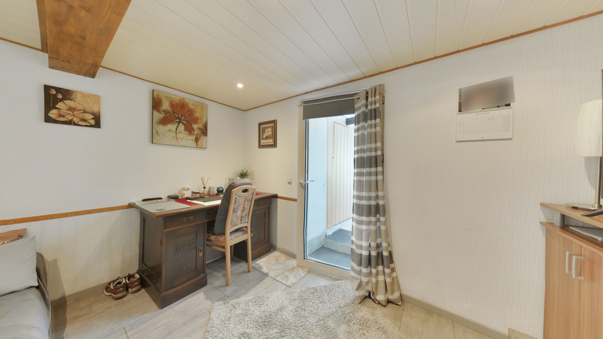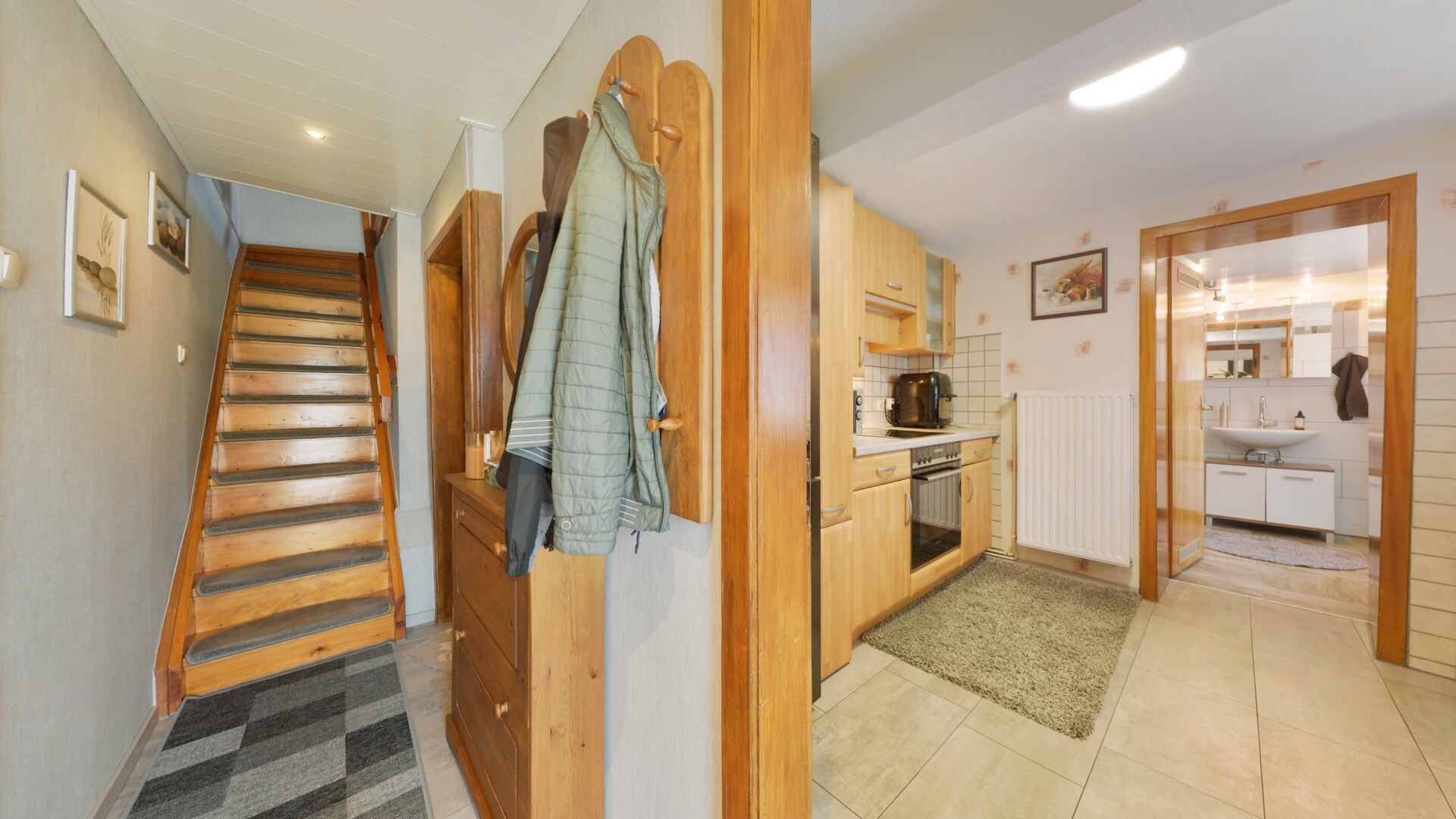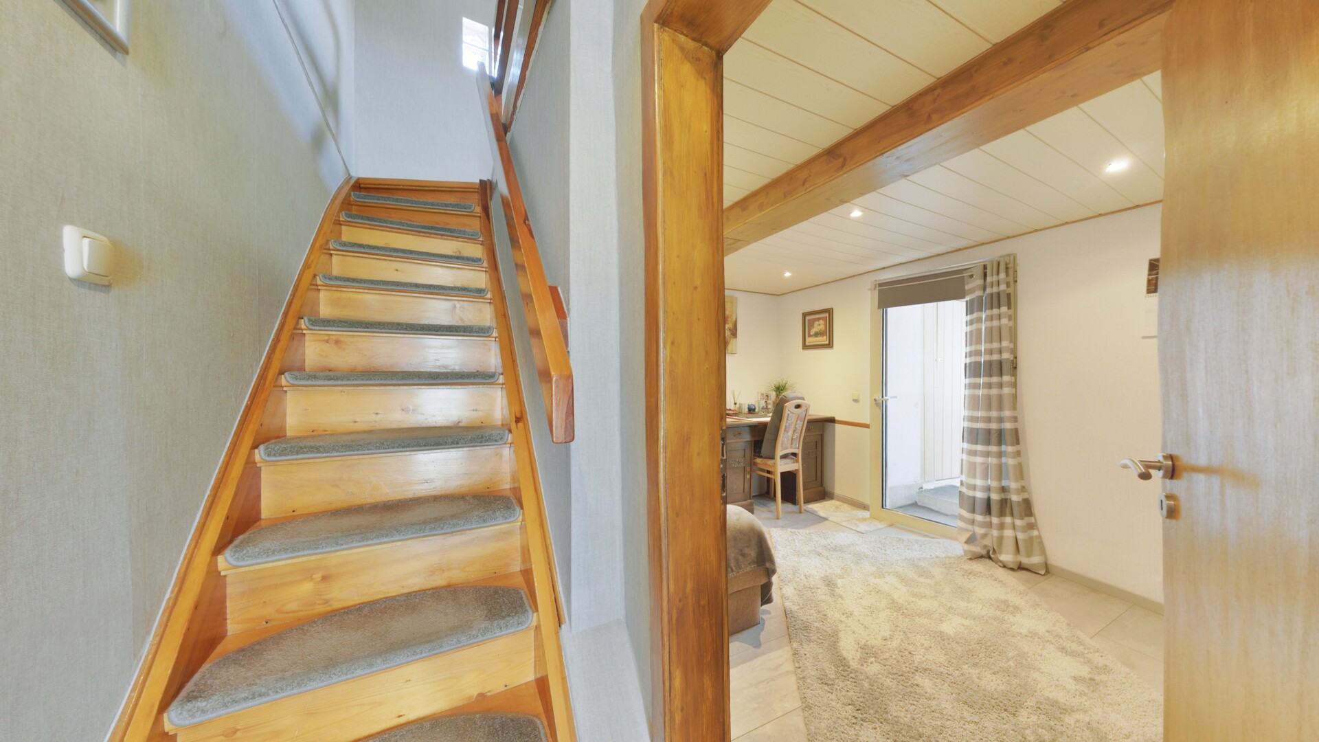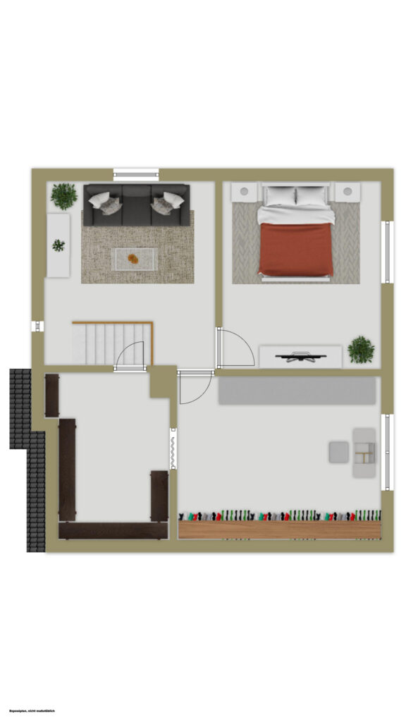 Obergeschoss: Über die charaktervolle Holztreppe gelangen Sie in den privaten Rückzugsbereich. Die sichtbaren Deckenbalken in den Schlafräumen verleihen dem Obergeschoss eine besonders behagliche, fast rustikale Atmosphäre.