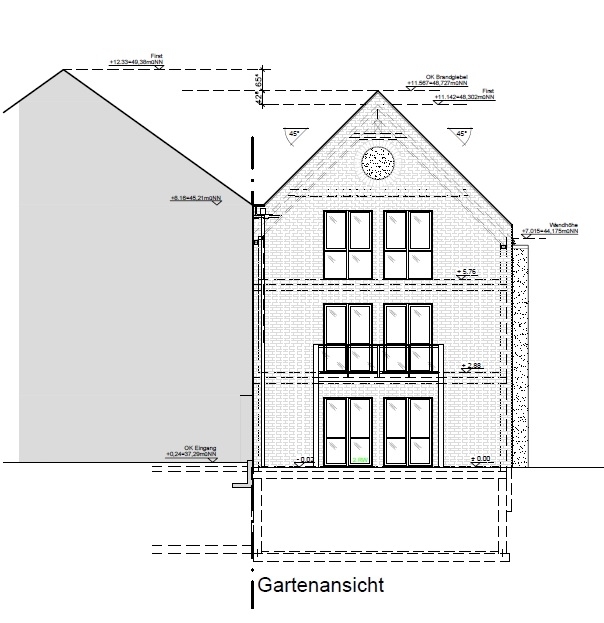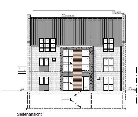 Für das Grundstück liegt bereits eine Baugenehmigung für den Bau eines unterkellerten, 2,5-geschossigen 3-Parteien-Hauses vor, das einseitig an ein Nachbargebäude angebaut wird. Die geplante Wohnfläche beträgt ca. 262 m². Zusätzlich sind ein Carport mit drei KFZ-Stellplätzen, fünf Fahrradstellplätze sowie ein Spielplatz im hinteren Grundstücksbereich genehmigt.