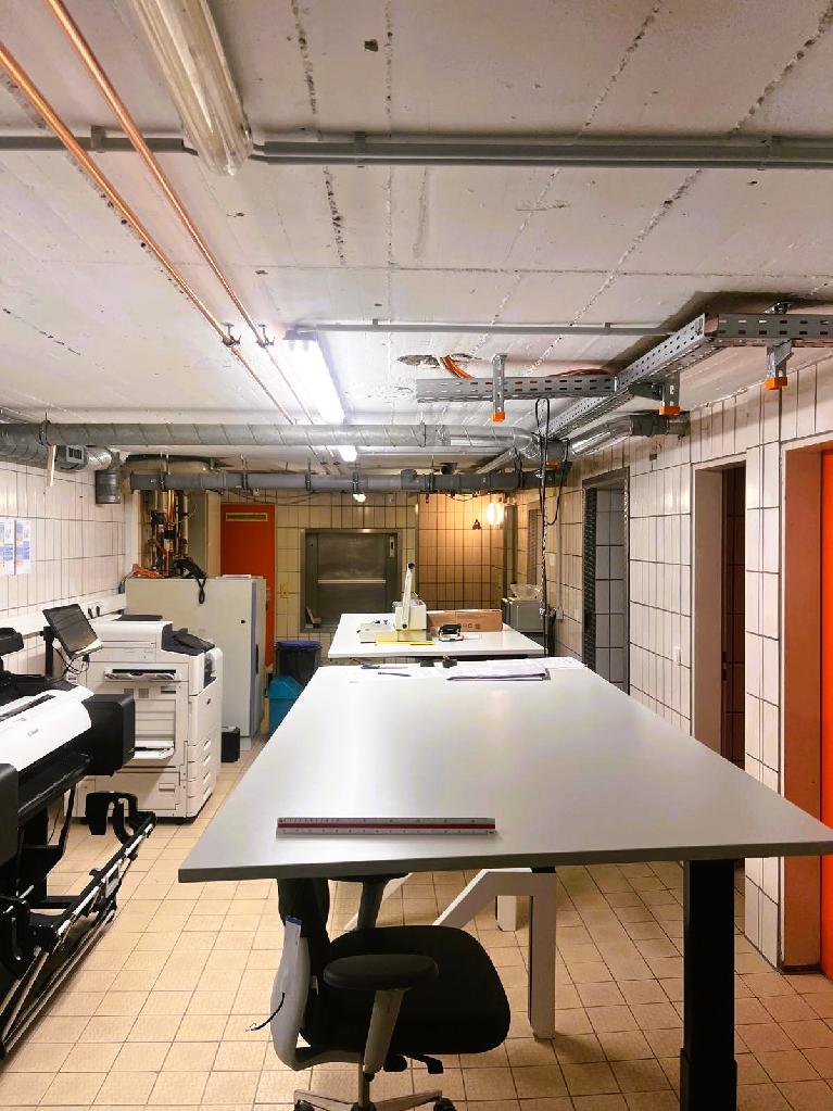 Das Untergeschoss bietet eine großzügige, offene Fläche, die vielseitig genutzt werden kann, sei es als Lagerraum oder für weitere betriebliche Anforderungen. Zusätzlich befinden sich hier zwei Aktenkeller, die zusätzlichen Stauraum für Dokumente oder Materialien bieten. Ein Technikraum ist ebenfalls vorhanden und sorgt für die zentrale Versorgung des Objekts. Eine Teeküche im Untergeschoss integriert. Ein weiteres WC rundet das Angebot im Untergeschoss ab.