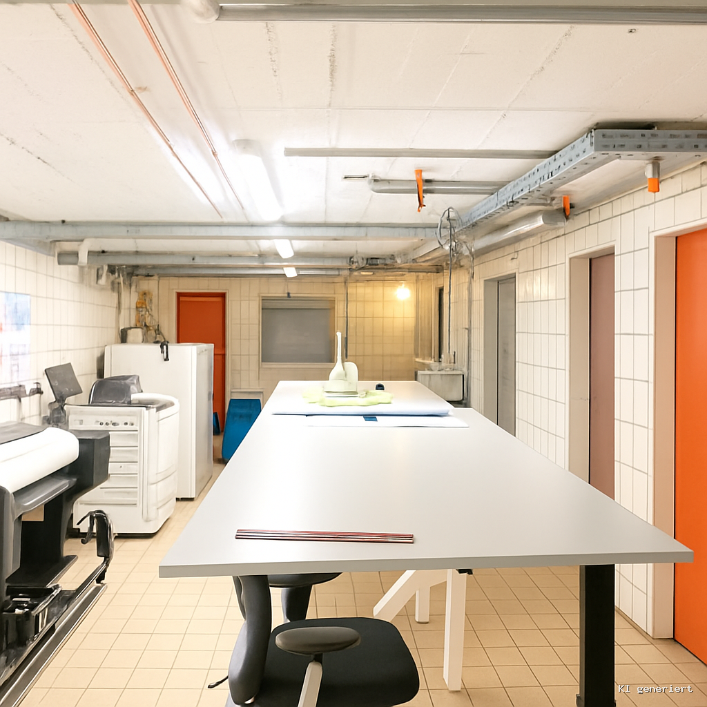 Das Untergeschoss bietet eine großzügige, offene Fläche, die vielseitig genutzt werden kann, sei es als Lagerraum oder für weitere betriebliche Anforderungen. Zusätzlich befinden sich hier zwei Aktenkeller, die zusätzlichen Stauraum für Dokumente oder Materialien bieten. Ein Technikraum ist ebenfalls vorhanden und sorgt für die zentrale Versorgung des Objekts. Eine Teeküche im Untergeschoss integriert. Ein weiteres WC rundet das Angebot im Untergeschoss ab.