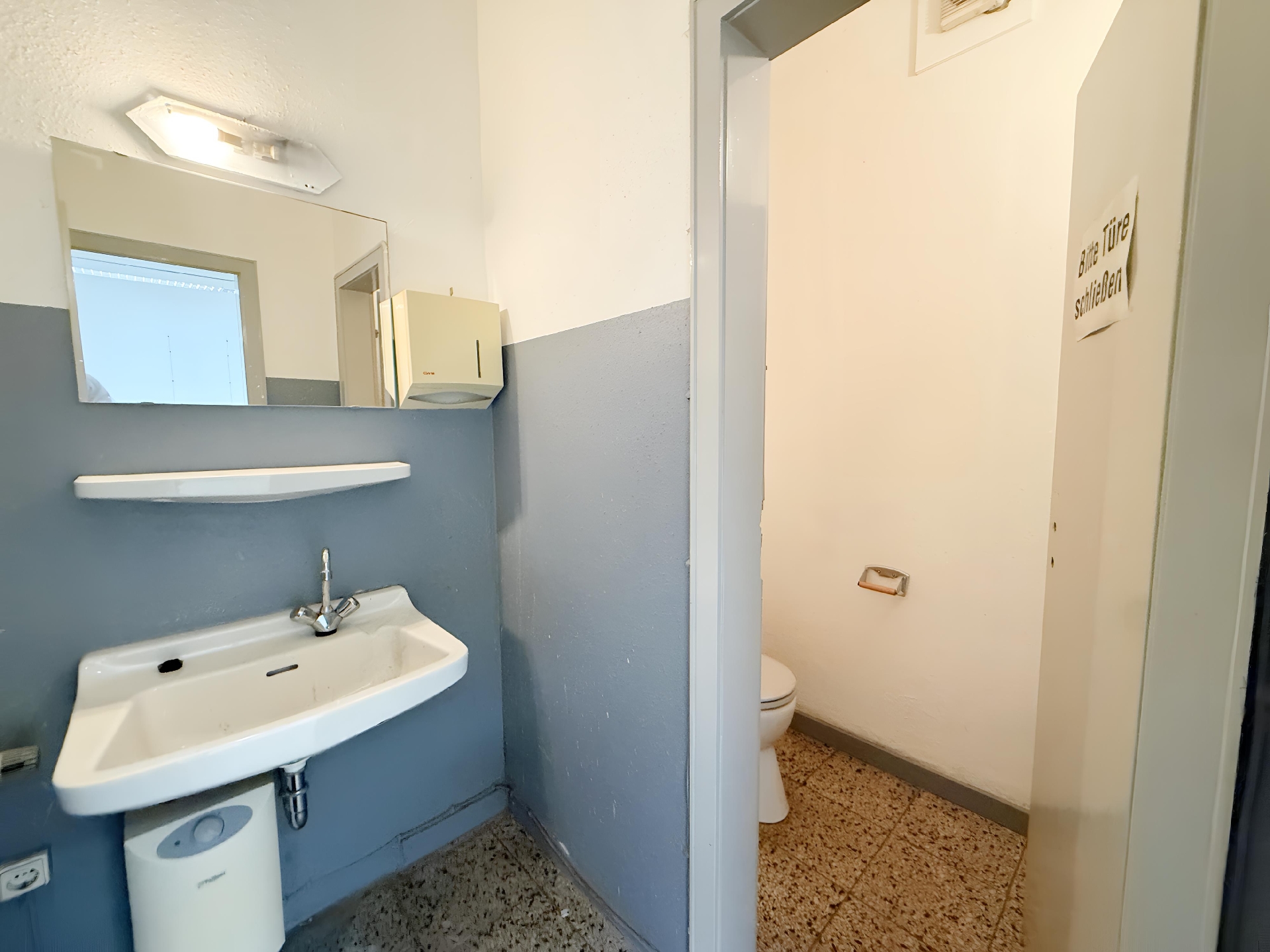 Die zweite Einheit kann ebenfalls eigenständig genutzt werden und verfügt ebenfalls über eine eigene Sanitäreinrichtung. Besonders hervorzuheben ist die angeschlossene Hoffläche, die exklusiv dieser Einheit zugeordnet ist. Hier stehen zwei Pkw-Stellplätze zur Verfügung, die auch als Anlieferzone oder für andere geschäftliche Zwecke genutzt werden können. Der Zugang erfolgt über den rückwärtigen Bereich der Immobilie.
